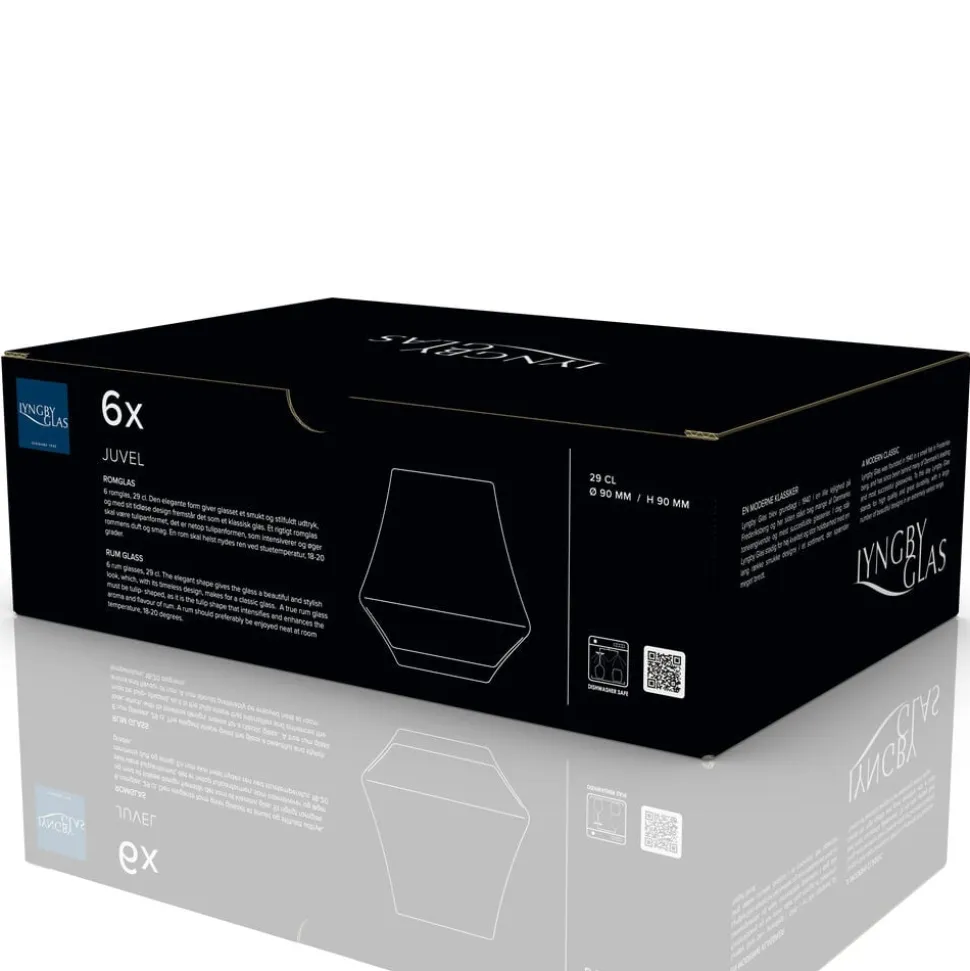 6 romglas, 29 cl. Den elegante form giver glasset et smukt og stilfuldt udtryk, og med sit tidløse design fremstår det som et klassisk glas. Et rigtigt romglas skal være tulipanformet, det er netop tulipanformen, som intensiverer og øger rommens duft og smag. En rom skal helst nydes ren ved stuetemperatur, 18-20 grader. 9 cm.