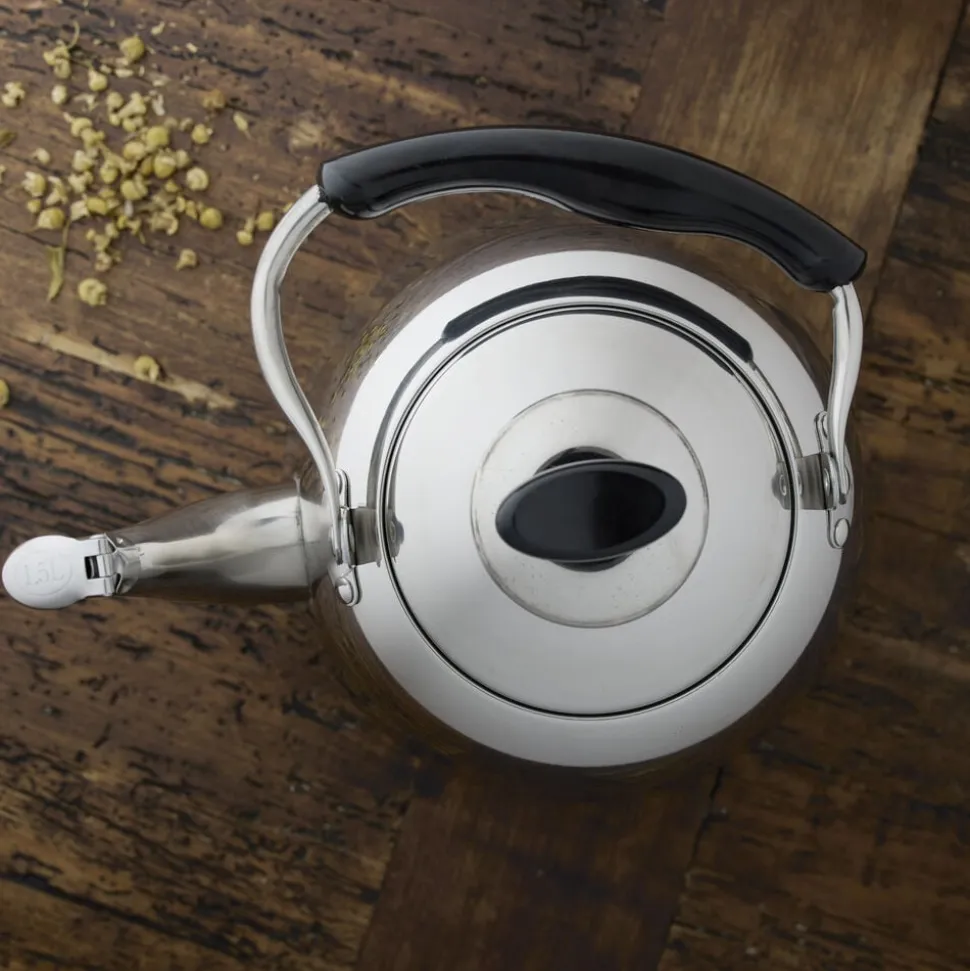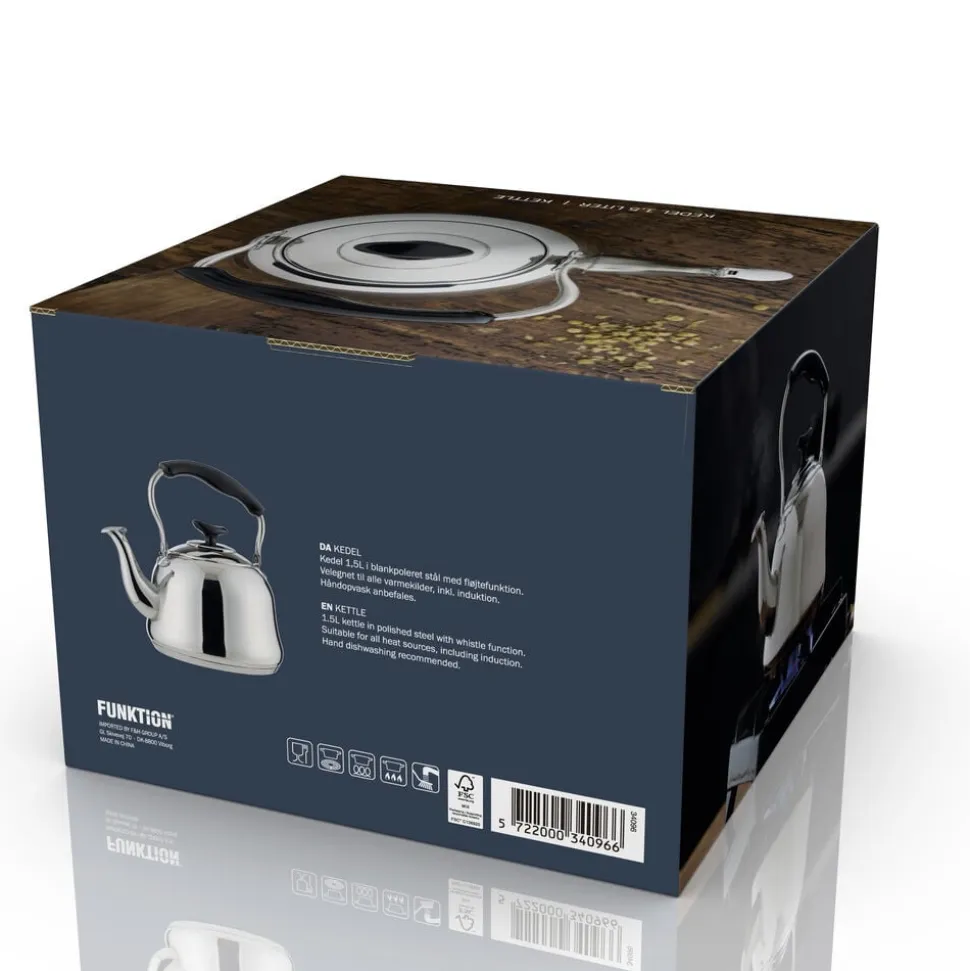 Kedel 1,5L i blankpoleret stål med fløjtefunktion. Velegnet til alle varmekilder, inkl. induktion. Håndopvask anbefales.
