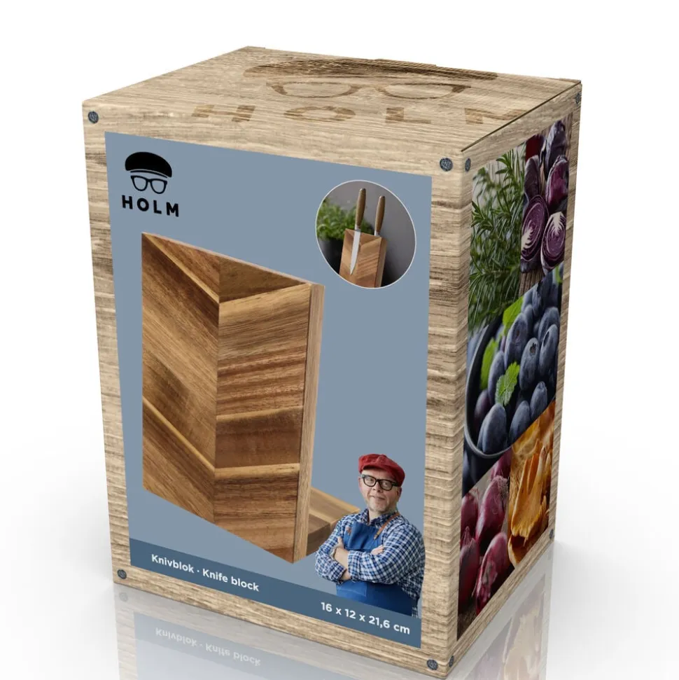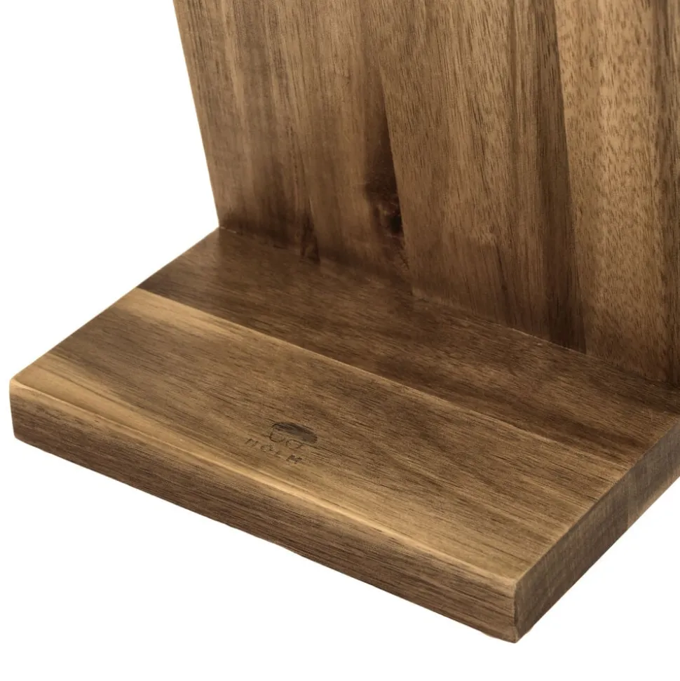 Smuk magnetisk knivblok i akacietræ i sildebensmønster. Den tunge fod sikrer, at blokken står solidt og sikkert på bordet. Knivblokken har dobbelt opbevaringsplads, idet knivene kan placeres på begge sider af blokken.