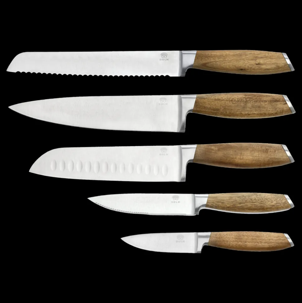 Knivsættet indeholder fem lækre knive – urtekniv 20 cm, universalkniv 24 cm, santokukniv 31 cm, kokkekniv 33 cm og brødkniv 33 cm. De flot rundede skafter, der ligger behageligt i hånden, er af akacietræ med virkeligt smukke og karakteristiske åretegninger og er afsluttet med en elegant stålkappe for enden af skaftet. Bladene er af rustfrit stål i høj kvalitet. Knivene skal vaskes i hånden med varmt vand og sæbe, også før første brug.