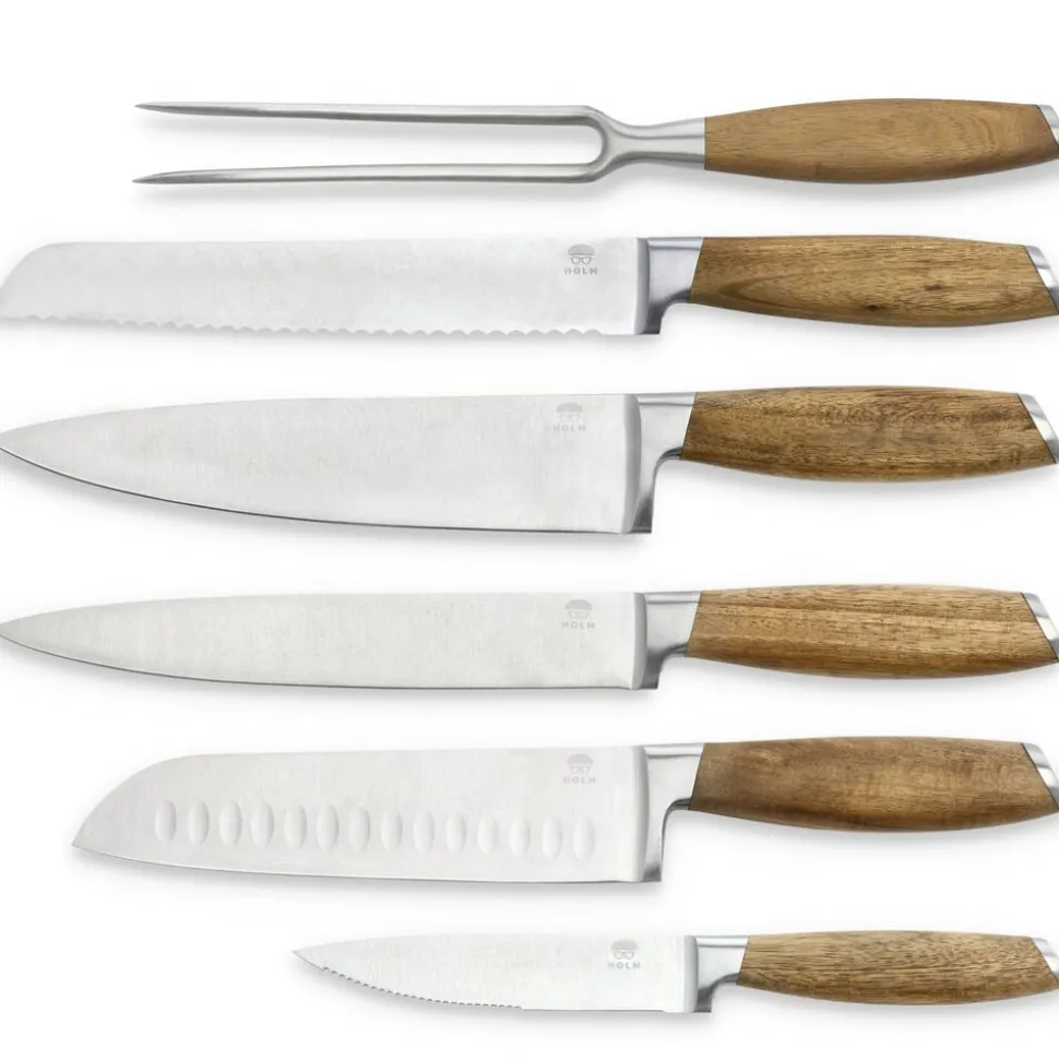 Knivsættet indeholder fem lækre knive – universalkniv 24 cm, santokukniv 31 cm, filetkniv 33 cm, kokkekniv 33 cm, brødkniv 33 cm – og en stegegaffel 29 cm. De flot rundede skafter, der ligger behageligt i hånden, er af akacietræ med virkeligt smukke og karakteristiske åretegninger og er afsluttet med en elegant stålkappe for enden af skaftet. Bladene er af rustfrit stål i høj kvalitet. Knivene skal vaskes i hånden med varmt vand og sæbe, også før første brug.