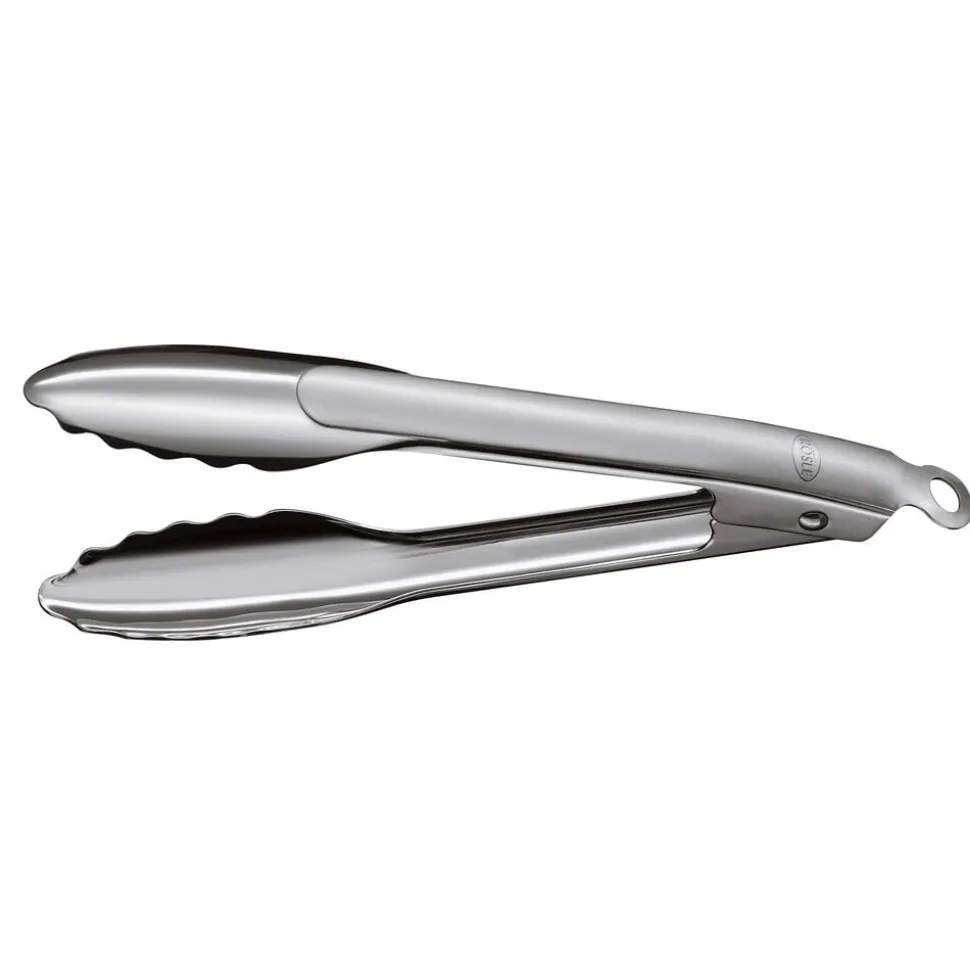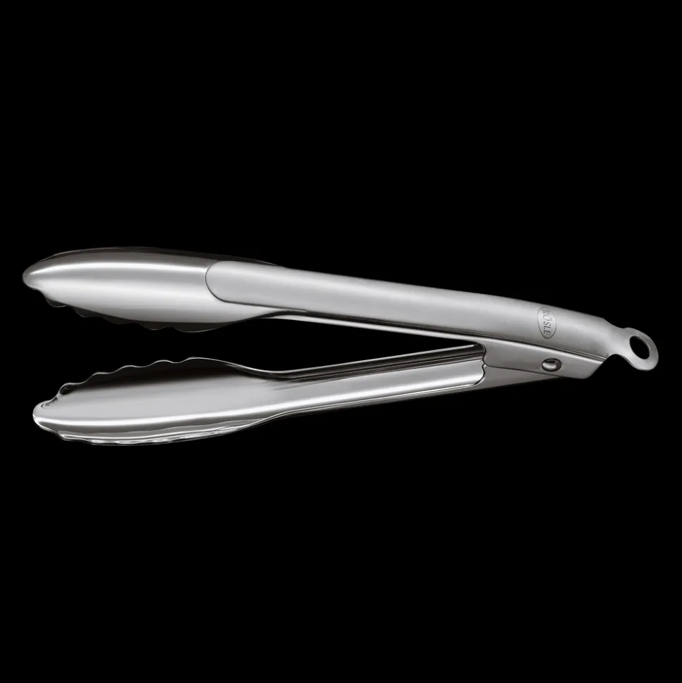 RÖSLE køkkentang med patenteret åbnemekanisme, der gør det muligt at åbne og låse tangen med kun én hånd. Tåler opvaskemaskine. Sikker og komfortabel håndtering er sikret gennem det ergonomiske design. Køkkentangen kan låses på pladsbesparende vis, når den ikke er i brug.