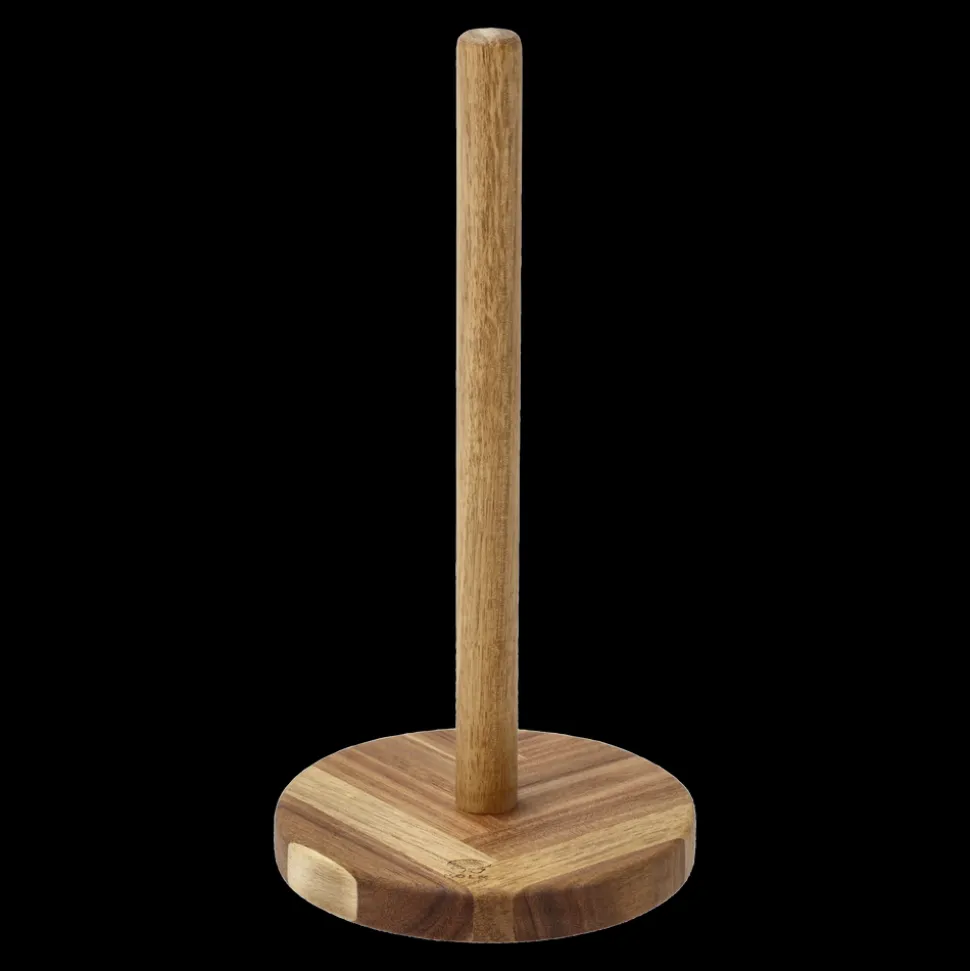 Rustik køkkenrulleholder af akacietræ med fod i smukt sildebensmønster. Enkel og flot at have stående fremme på køkkenbordet. Rengøring bør altid ske med en hårdt opvredet klud. Akacietræ kan med fordel efterbehandles med madolie et par gange om året for at beskytte det og for at fremhæve træets glød. 28 cm høj, diameter 14 cm.