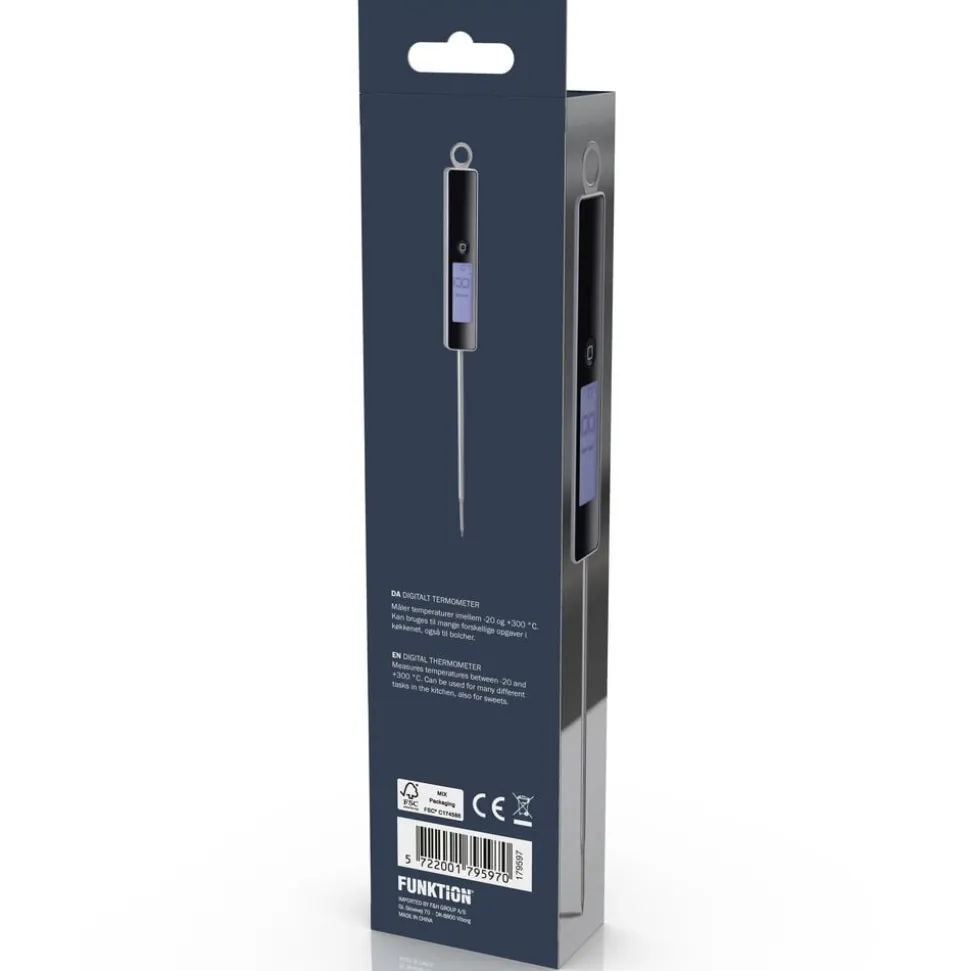 Smart og enkelt digitalt termometer med LCD display. Kan bruges til mange forskellige opgaver i køkkenet, også til bolcher. Greb i plast og temperaturspyd i stål. Måler temperaturer imellem -20 og +300 C.