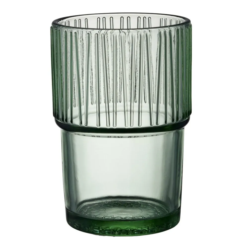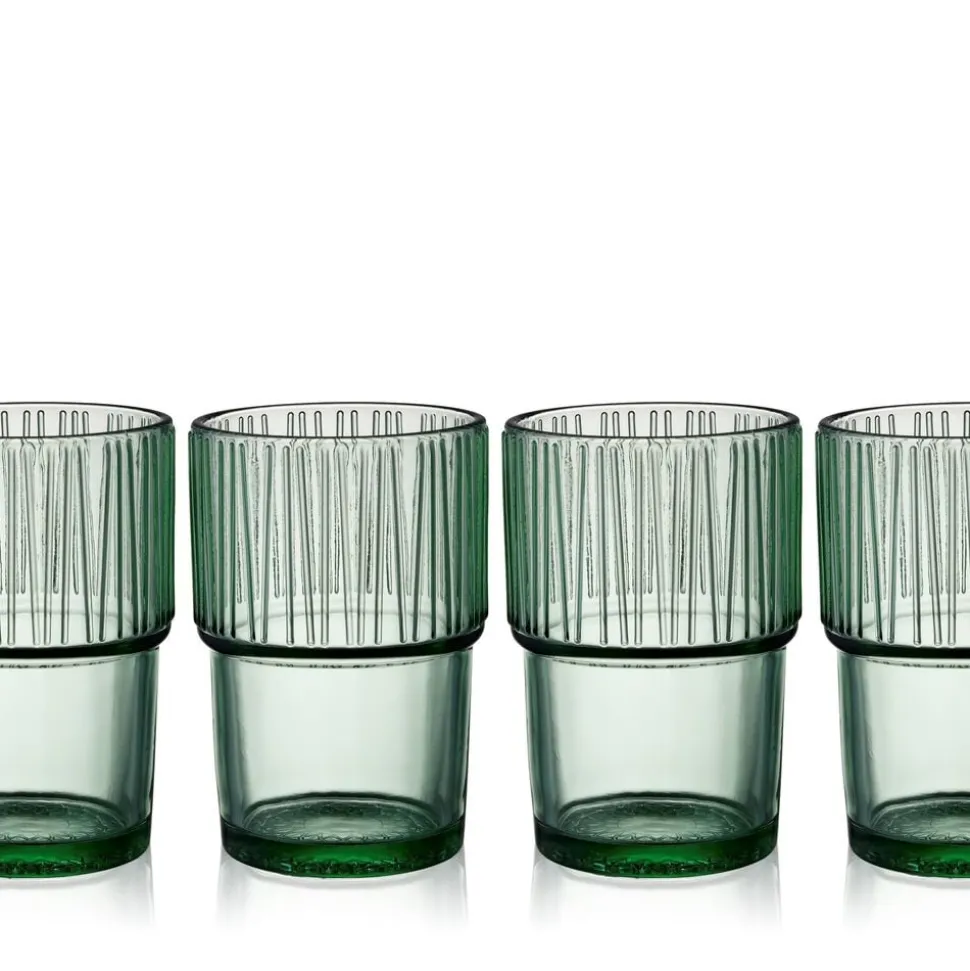 4 stabelbare caféglas, 38 cl, i gennemfarvet glas til både kolde og varme drikke. Nyd caffe latte, te, chai latte, varm kakao og meget andet af de smukke og solide glas, der gør hverdagen lidt skønnere. Velegnet til opvaskemaskine. Når du køber fra Kusintha-kollektionen, støtter du udsatte børn i verdens fattigste områder.
