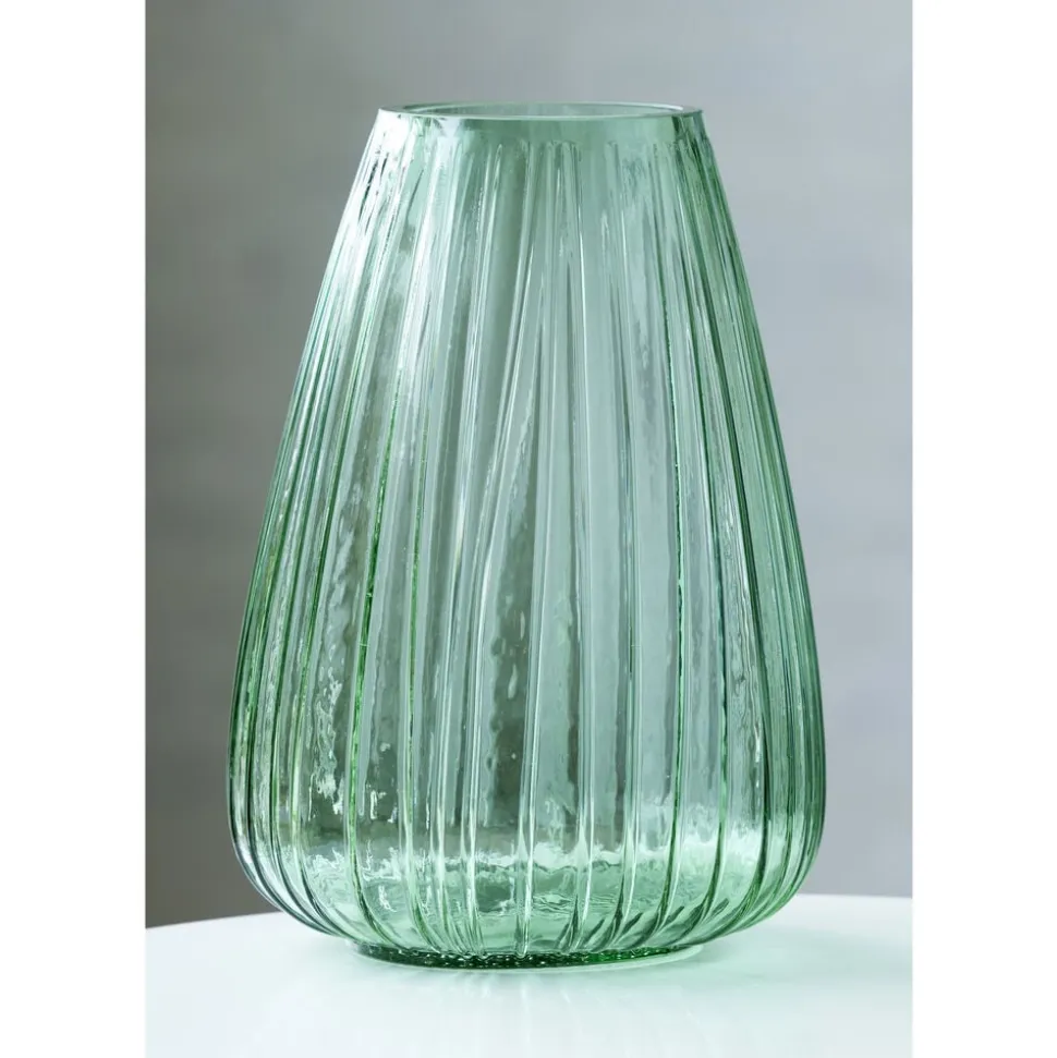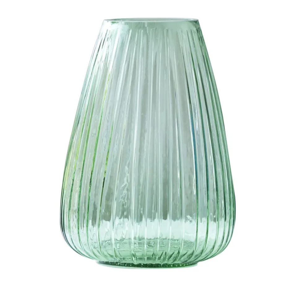 Den flotte vase i gennemfarvet glas har det samme fine, riflede look som Kusintha-seriens vandglas- og flasker. Vasen fås i grøn, amber, pink, blå og smoke. Når du køber fra Kusintha-kollektionen, støtter du samtidig udsatte børn i verdens fattigste områder. 22 cm høj.