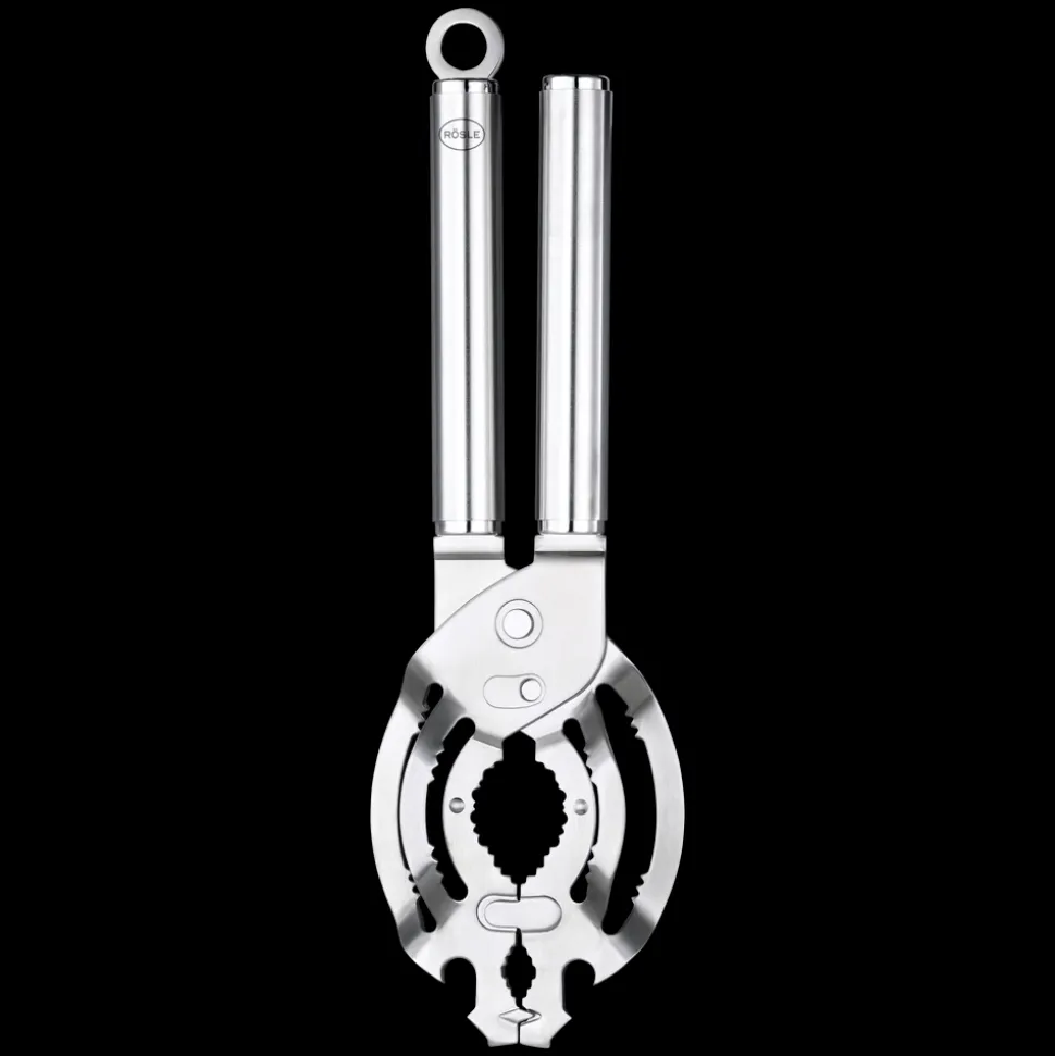 RÖSLE lågåbner kan åbne genstridige låg og skruelåg på glas og flasker med en diameter fra 10 til 100 mm. Lågåbneren har integreret flaskeåbner og en smart funktion, der nemt løfter dåseringe på konservesdåser. Kan bruges af både højre- og venstrehåndede. Lågåbneren er fremstillet i rustfrit stål, der tåler opvaskemaskine.