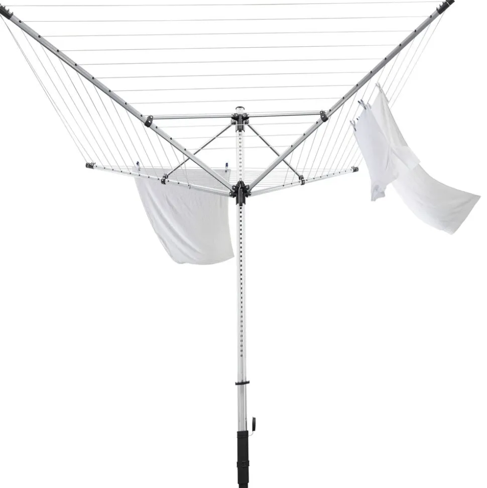 Linolift 600 Quick Start Plus tørrestativ med 60 meter tørreplads og ca. 6 maskinfulde vasketøj. Kan justeres i en arbejdshøjde fra 85 cm til 180 cm, så den passer præcis til det ønskede behov. Stativet åbnes hurtigt op ved at trække i en snor. Der medfølger et praktisk beskyttelsesovertræk, som holder stativet rent når det ikke er i brug. Tørrestativet kan monteres med det samme ved hjælp af en jordskrue, som bores ned i jorden, der hvor du ønsker at placere stativet. Tørrestativets midterstang har en diameter på 45 mm.