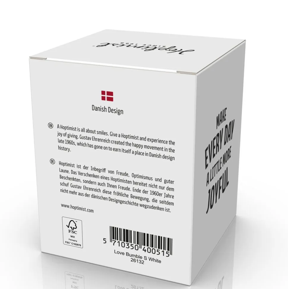 Love Bumble er til en du holder af. Måske en kæreste, din mor eller en person, du bare savner. Hoptimisten har et aftageligt hjerte, hvorpå du kan sætte en personlig hilsen til den, du kan lide. Der medfølger 6 klistermærker med teksten I Miss U, Best Dad, Best Mom, I Love U, Be Mine og Get well.