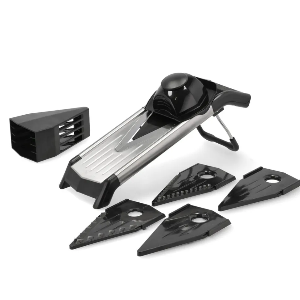 Mandolinjern i rustfrit stål. Indeholder 5 forskellige indsatser til at rive, snitte og strimle alle slags grøntsager, frugter eller hårde oste. Mandolinjernet har håndtag og skridsikre fødder, som giver en god stabilitet under arbejdet. Alle dele er velegnet til maskinopvask.