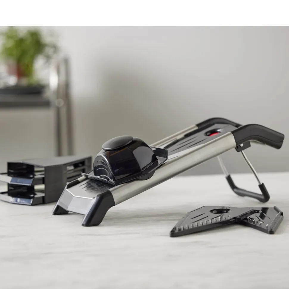 Nemt at indstille til tykke eller tynde skiver på 1,5 mm, 2,5 mm og 3,5 mm. Der medfølger også Julienne-indsatser som skærer strimler på 3,5 mm og 7 mm.