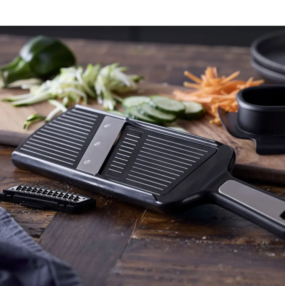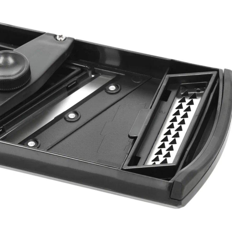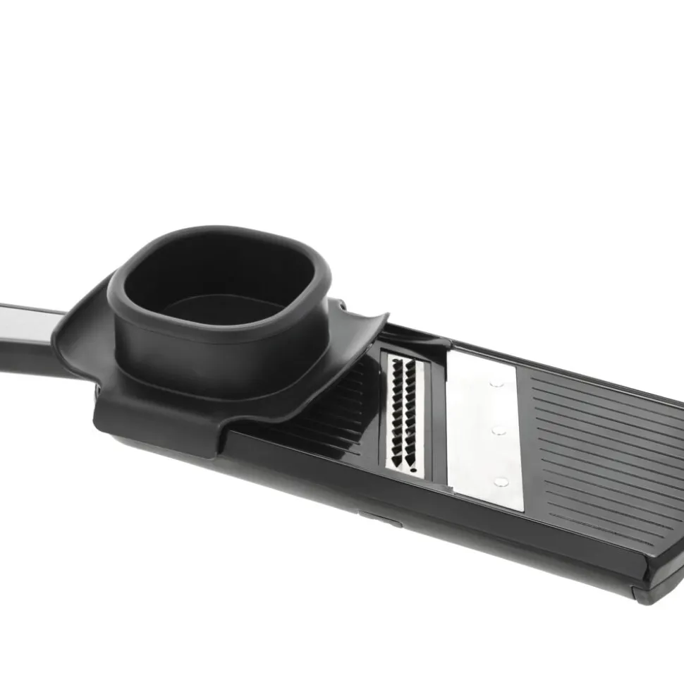 Håndholdt mandolinjern med to udskiftelige skær – ét til skiver og ét til strimler. Det er nemt at justere tykkelsen på skiver eller strimler med den praktiske skrue på bagsiden. Det skær, der ikke er i brug, opbevares sikkert på mandolinjernets bagside. Fingrene beskyttes under brug med den medfølgende holder. Perfekt til præcise og ensartede udskæringer i køkkenet. Let at rengøre og nem at opbevare.