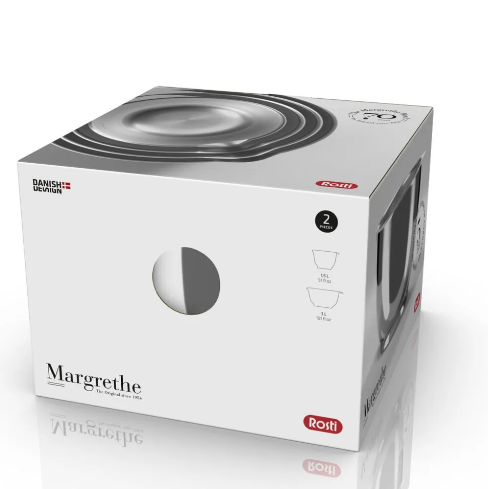 Flot og eksklusivt sæt i stål af den kendte og elskede Margrethe-skål – 1,5 + 3 liter. Skålen er produceret i 18/8 stål og har satin-finish indvendig og blank finish udvendig. Kan vaskes i opvaskemaskine og bruges i fryser, men ikke i mikroovn. 5 års garanti.
