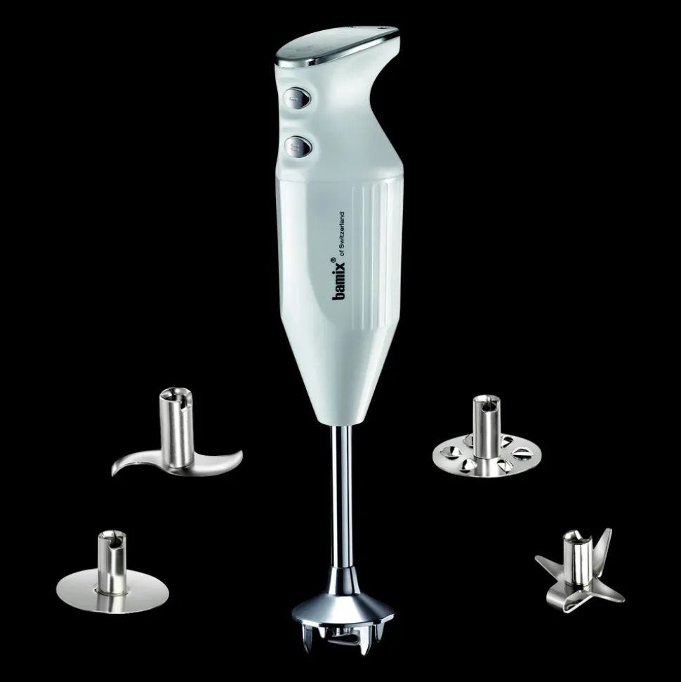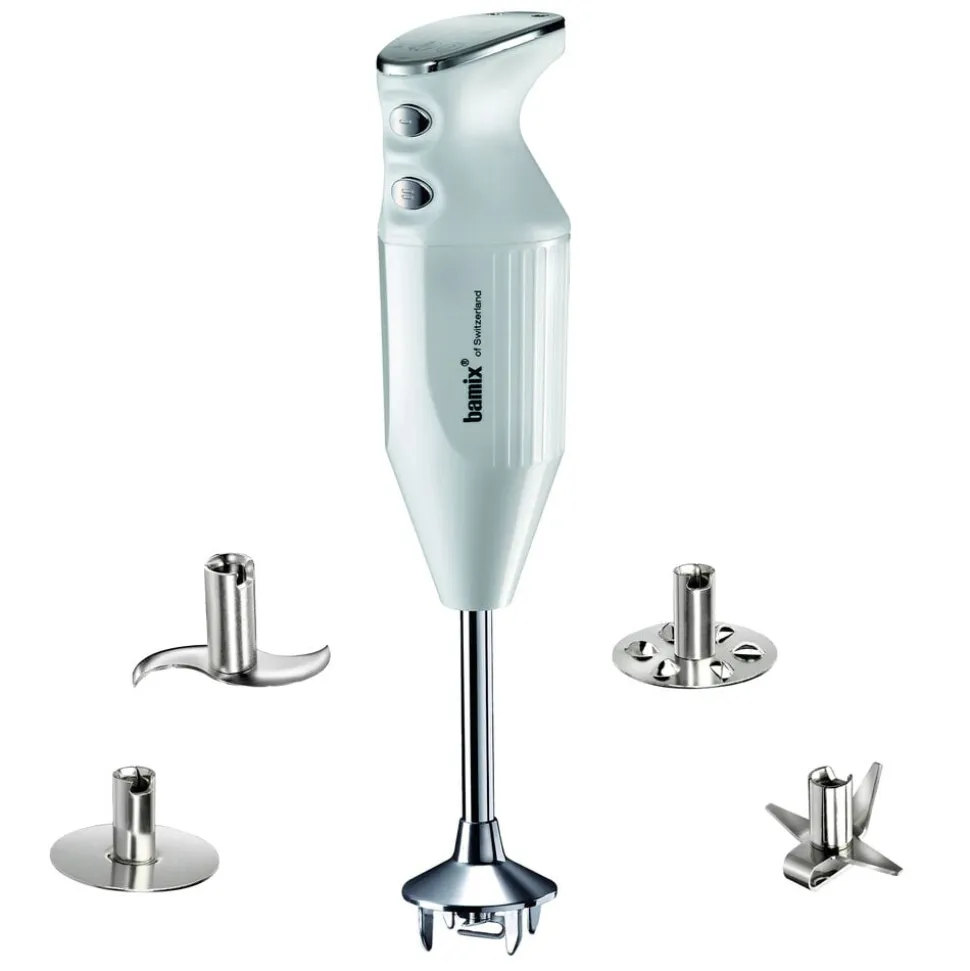 bamix® Maxx-stavblender med en kraftig 300 watt motor, der sikrer pålidelig hjælp til selv de hårdeste opgaver i køkkenet. Stavblenderen har to hastighedsindstillinger og en praktisk spiralledning, der giver masser af fleksibilitet. Til produktet medfølger en multifunktionskniv, blenderskive, piskeskive og kød- og grøntsagskniv samt en instruktionsmanual. Livstidsgaranti på motor.