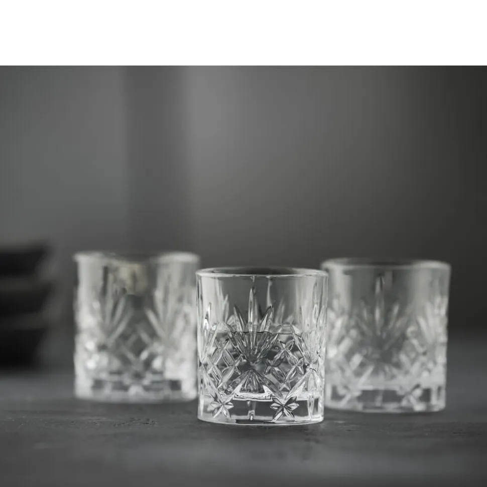 Elegante shotglas som fremhæver indholdets nuancer, når omgivelsernes lys og skygger reflekteres i glassets smukke mønster. De små glas har en størrelse, som passer perfekt til hverdagens supersunde grøntsagsshots, jule- og påskefrokoster eller andre festligheder med snaps og lign. Tåler opvaskemaskine. 8 cl, 6 stk.
