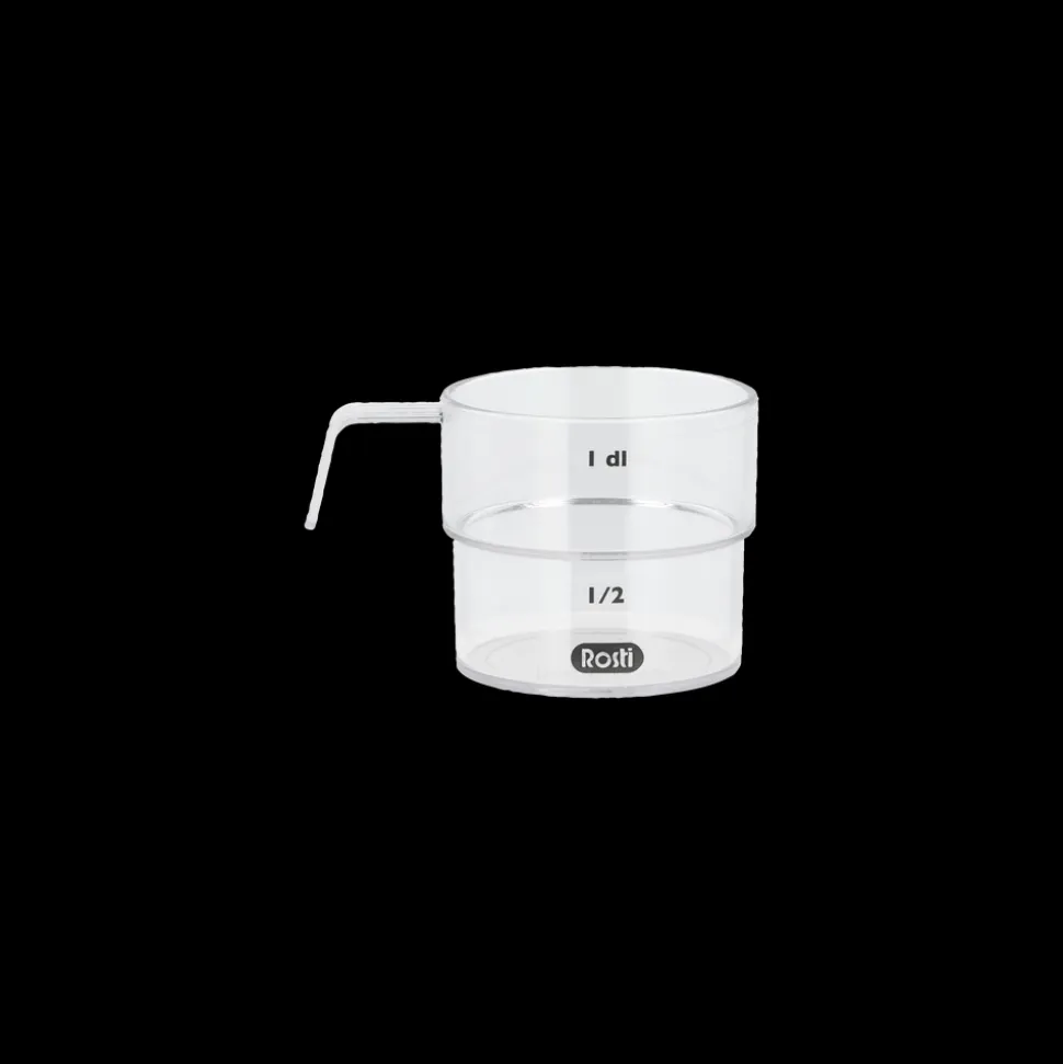 Mensura decilitermålet har et markant design med en tydelig markering midtpå, som angiver en halv deciliter. Den samme markering i formgivningen gør det nemt at stable flere målebægre. Håndtaget giver et godt og sikkert greb.