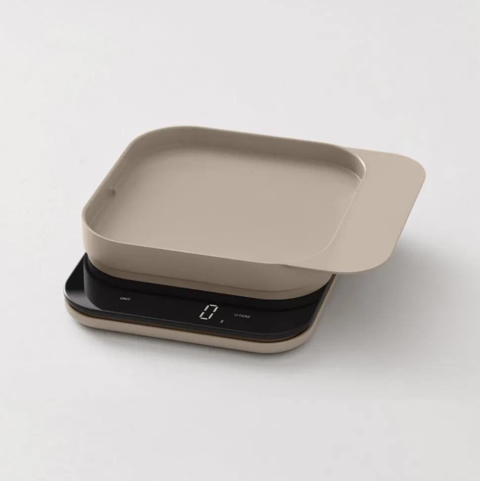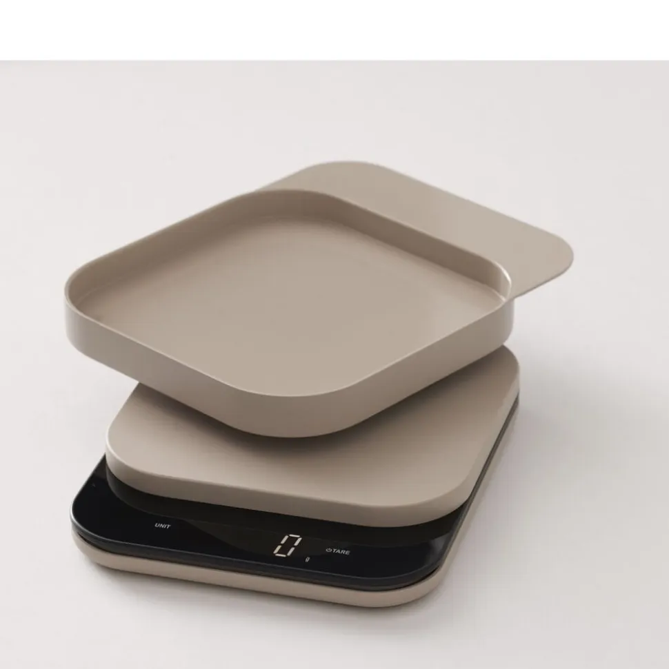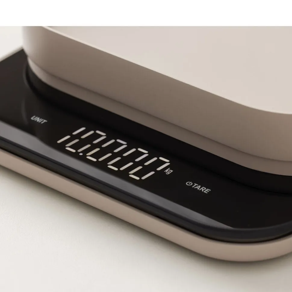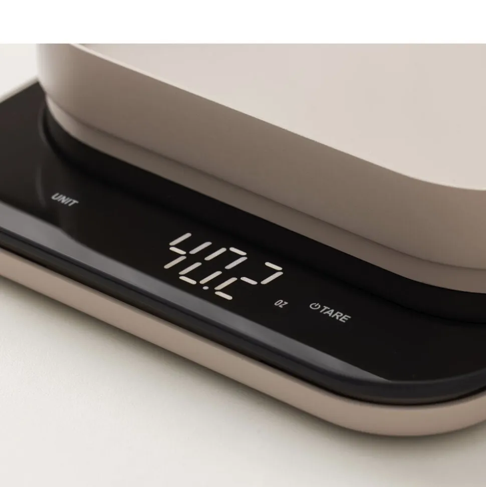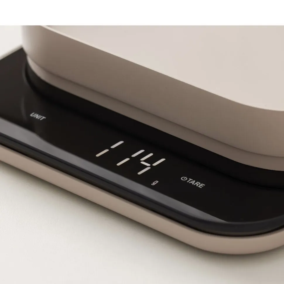 Der kan skiftes mellem flere måleenheder, g, kg, oz, lb, ml, fl oz, og vægten har tarafunktion. Tændes manuelt og slukker automatisk. Fire L-formede silikonefødder i samme farve som vægten er placeret under bunden.