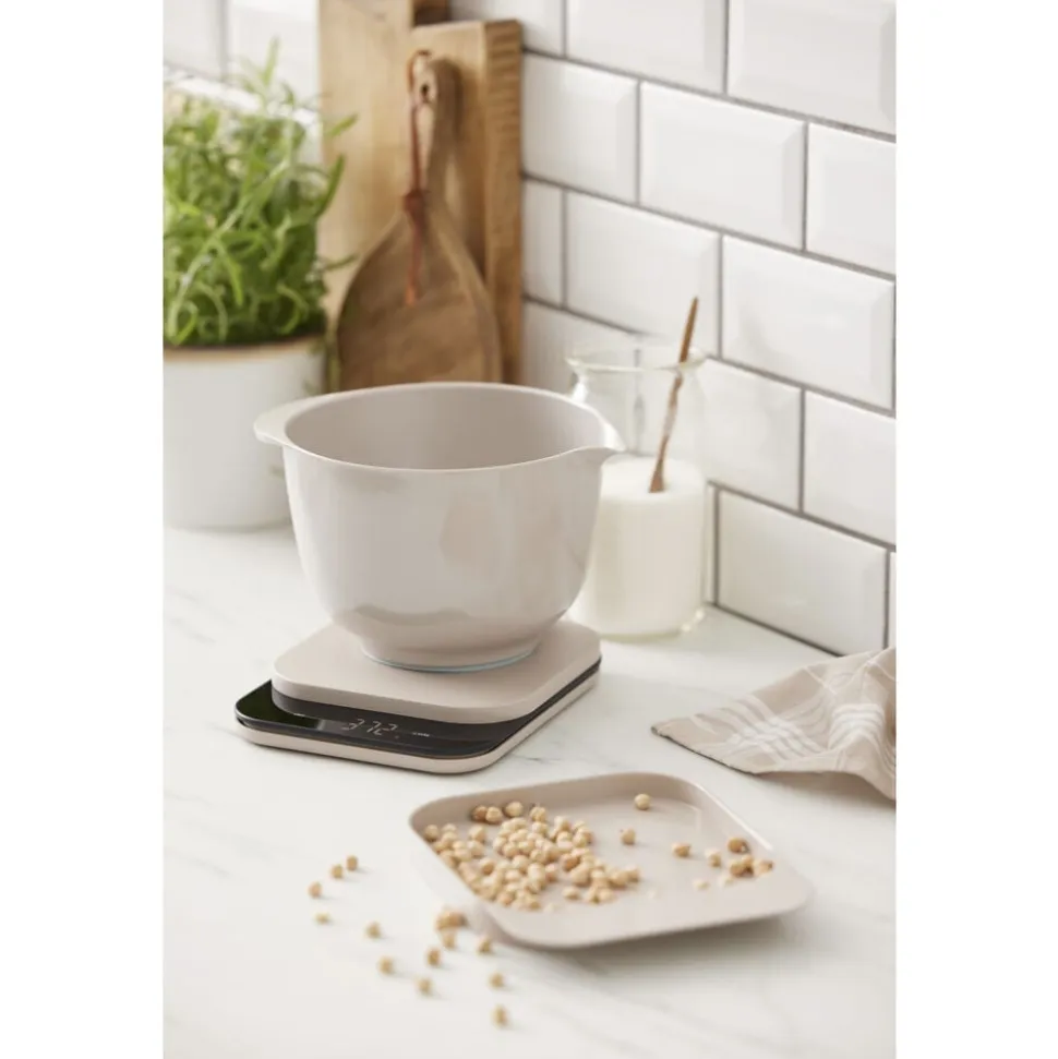 Mensura køkkenvægten med LED-display vejer op til 10 kg/22 lb med 1 g/0,1 oz interval. Skålen er fremstillet i ABS, den rummer 300 ml og fungerer som låg, når vægten ikke er i brug. Bruger 3 x AAA batterier (ikke inkluderet). 5 års garanti.