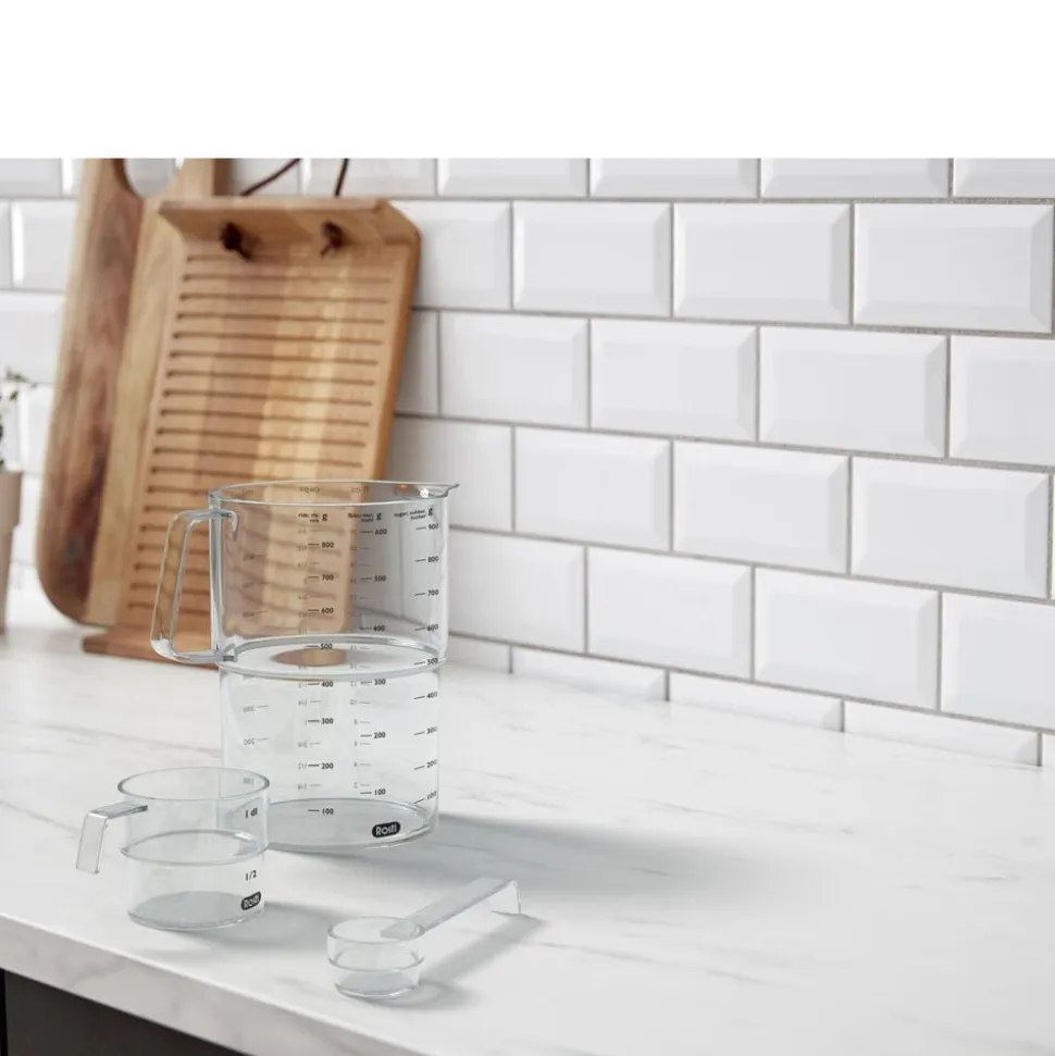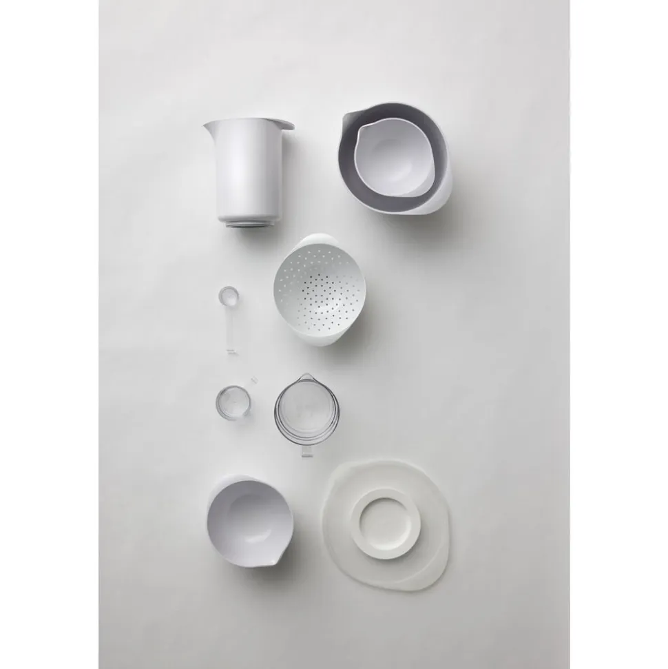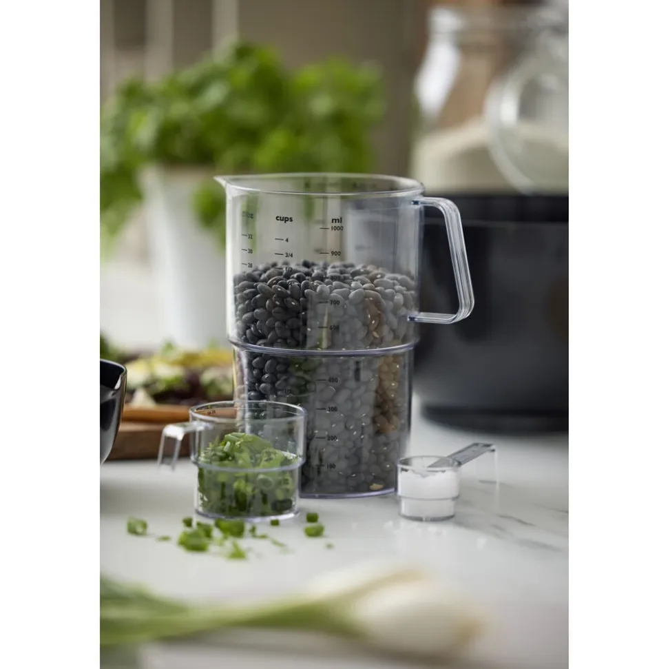 Mensura betyder ’at måle’ på latin, og formålet med Mensura-serien er netop at måle hurtigt og præcist. Det flotte design hjælper dig godt på vej, idet alle produkter er udformet med en markering midtpå, der opdeler i en halv/en hel liter på målekanden, en halv/en hel deciliter på målebægeret og teske/spiseske på måleskeen. Udformningen gør samtidig produkterne lette at stable.
