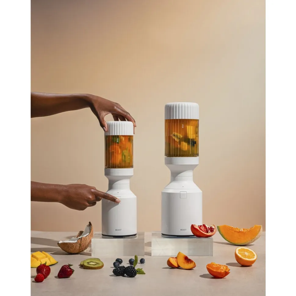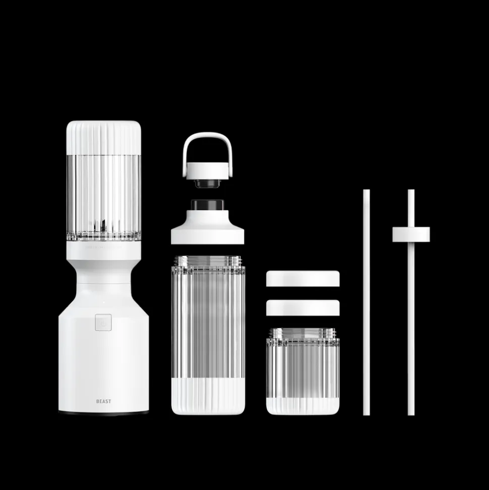 Beast Mighty Plus 850 leveres med tre blenderbeholdere (415, 638 og 786 ml), der fungerer som drikkebeholdere, når du sætter drikkelåg og sugerørshætte på og tager dem med dig på farten. Den rillede beholder giver dig et godt greb.