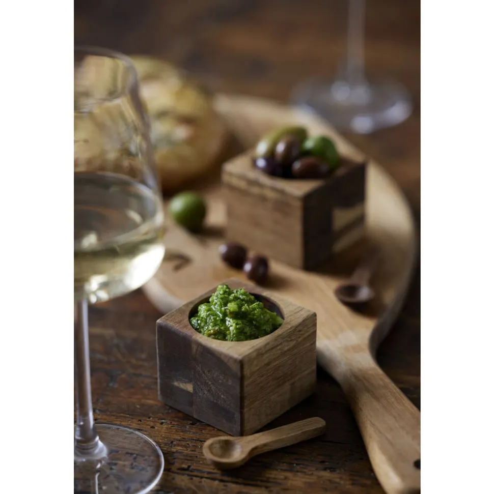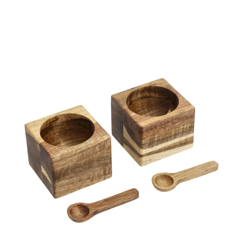Det lækre miniskålesæt med to firkantede skåle i smukt akacietræ er ideelt til salt, krydderier, dip, nødder og lignende. Der medfølger to fine skeer i akacietræ. Skålene måler 6 x 6 x 5 cm, og skeerne er 7 cm lange.
