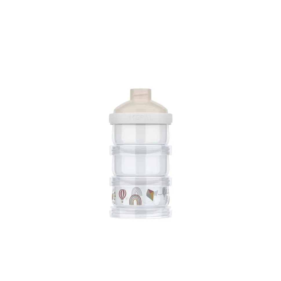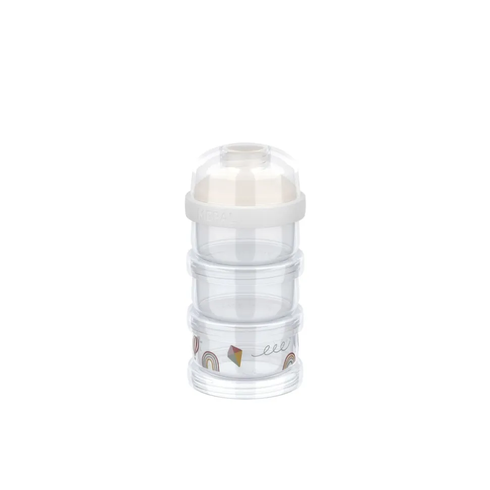 Med det tredelte Mepal Mio mælkepulvertårn er det nemt og hygiejnisk at have mælkepulver med dig overalt. De tre stabelbare beholdere på hver 120 ml er lukkes individuelt med skruelåg. Toppen har lufttæt forsegling, og den smarte hældetud gør det let at hælde mælkepulver i en flaske. Det kompakte design er ideelt til rejser og nemt at rengøre i opvaskemaskinen. Mælkepulvertårnet tåler desuden køleskab, fryser og mikroovn. Diameter 7,8 cm, højde 15,7 cm. PP-plast.