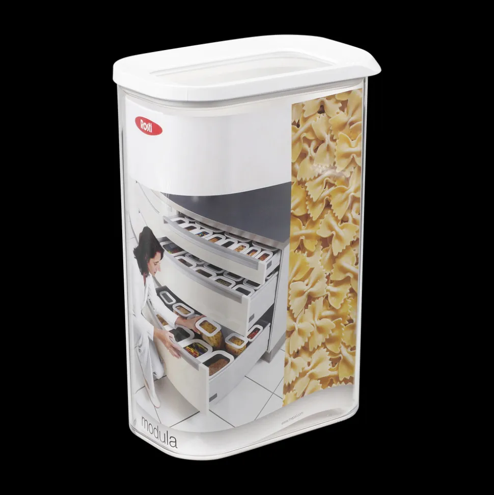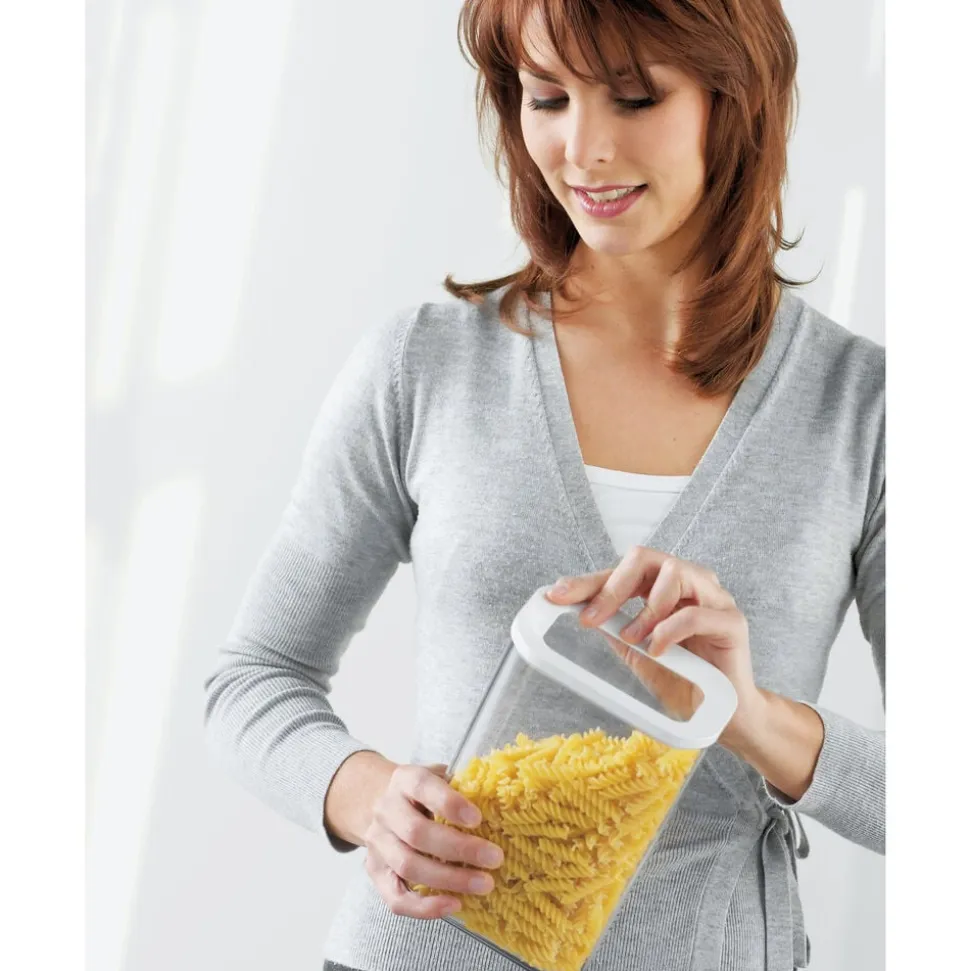 Modula opbevaringsboks med enkel, hvid kant på låget. Både boks og låg er gennemsigtige, hvilket gør det nemt at overskue indholdet. Mål: 14,5 x 9 x 22 cm Boksen er fremstillet af SAN-plast, som er robust og modstandsdygtig overfor ridser. Velegnet til opvaskemaskine men ikke til mikroovn og fryser.