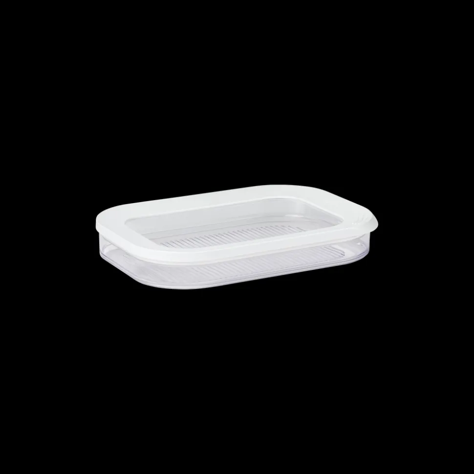 Modula opbevaringsboks med enkel, hvid kant på låget. Både boks og låg er gennemsigtige, hvilket gør det nemt at overskue indholdet. Mål: 22,5 x 16 x 3 cm. Boksen er fremstillet af SAN-plast, som er robust og modstandsdygtig overfor ridser. Velegnet til opvaskemaskine men ikke til mikroovn og fryser.