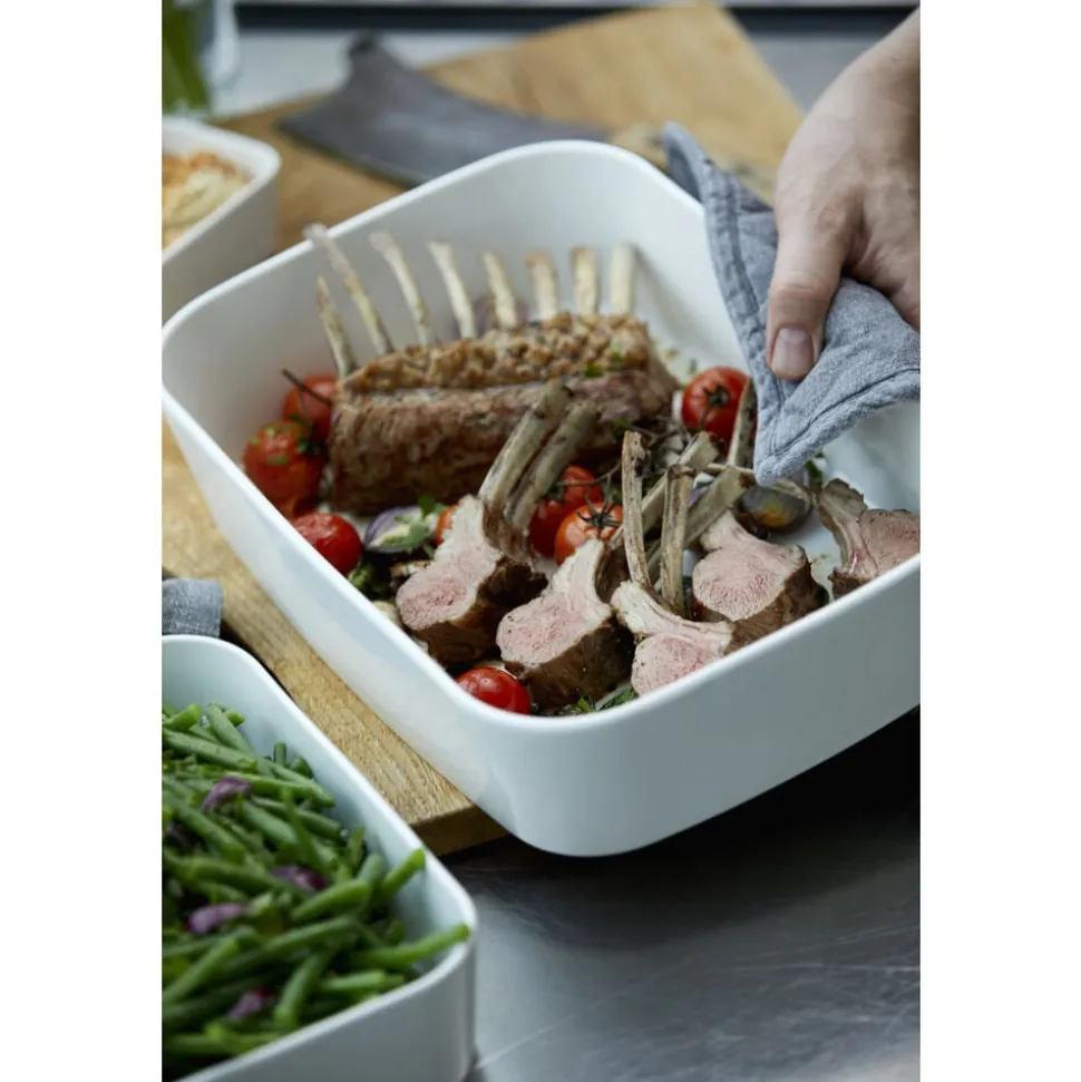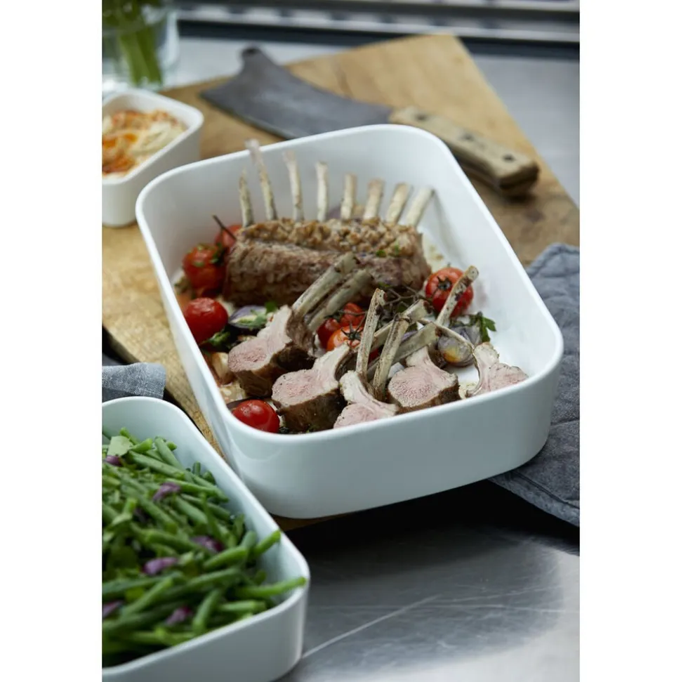 Ovnfast fad i hvidt porcelæn til det skandinaviske køkken. Fadet er fremstillet i forstærket porcelæn, der kan tåle ovntemperatur helt op til 350 grader. Den høje kant og praktiske form giver mange anvendelsesmuligheder. 25 x 18 x 6,5 cm.