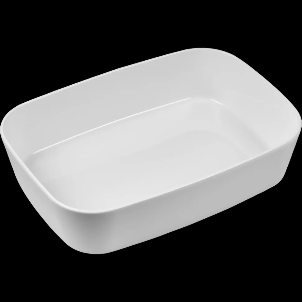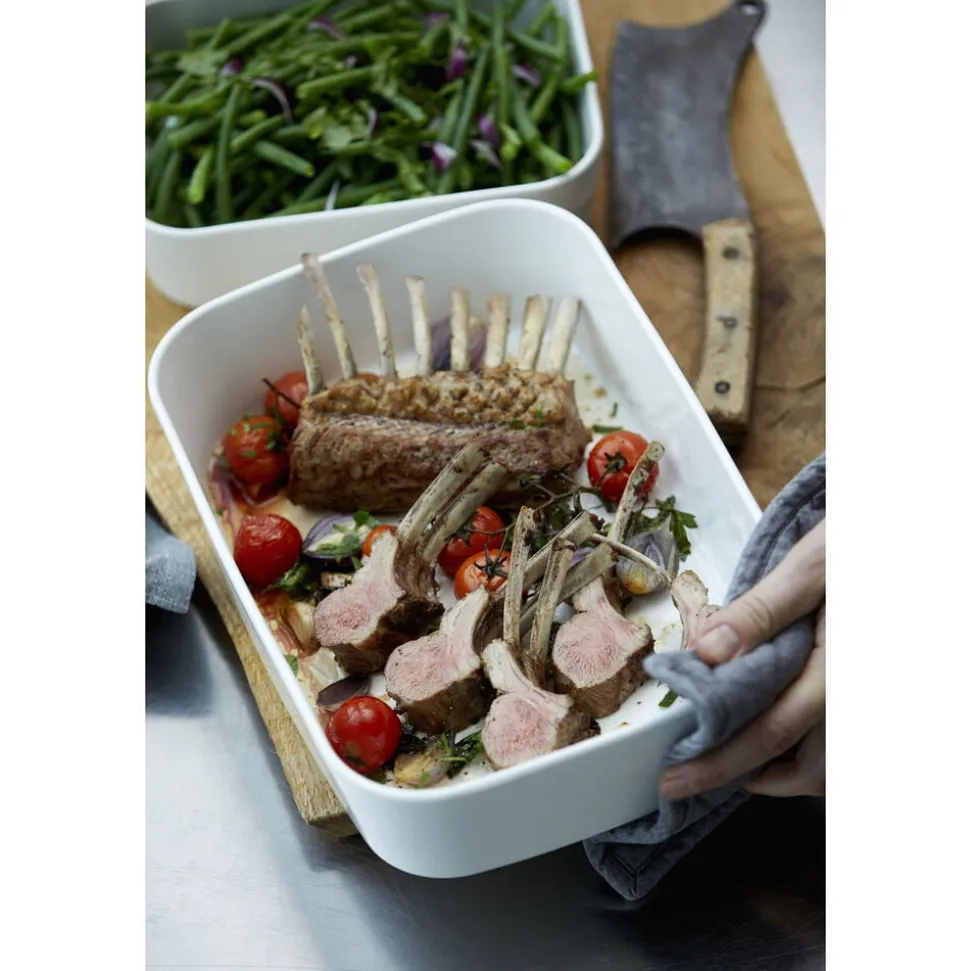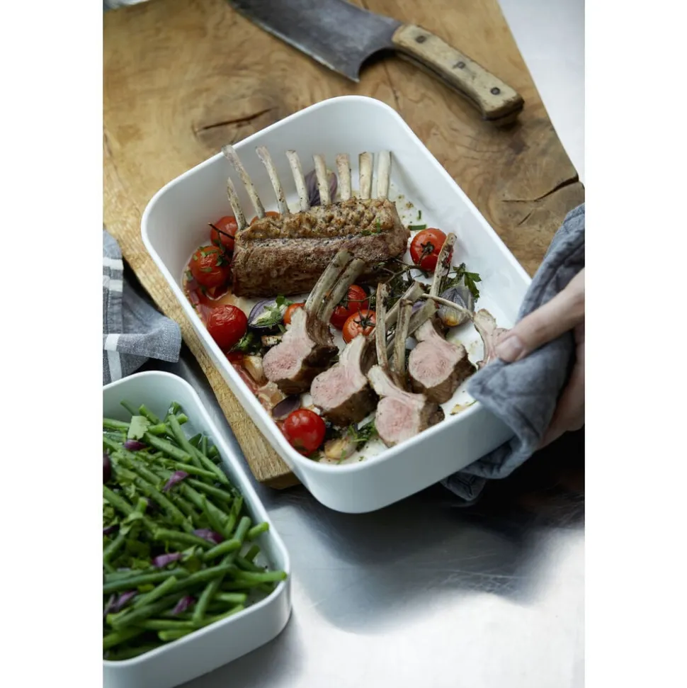 Ovnfast fad i hvidt porcelæn til det skandinaviske køkken. Fadet er fremstillet i forstærket porcelæn, der kan tåle ovntemperatur helt op til 350 grader. Den høje kant og praktiske form giver mange anvendelsesmuligheder. 35 x 25 x 8 cm.
