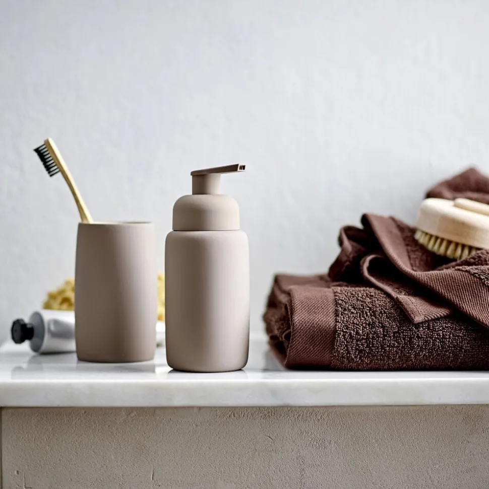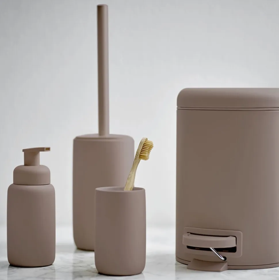 Södahls matte badserie har soft rubbercoating all over, også på sæbedispensertud og toiletbørsteskaft. Kruset er med lækker kontrastfarvet, blank glasur indvendigt.
