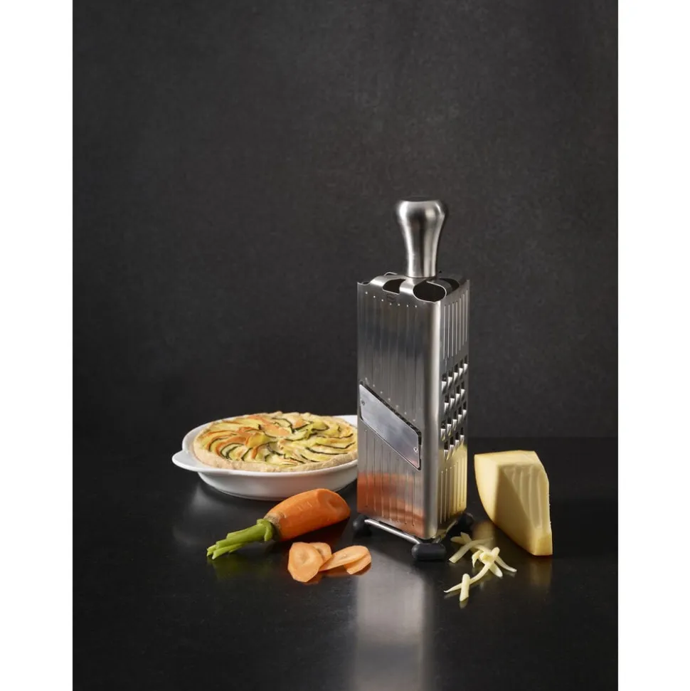 Kompakt multirivejern til at rive og snitte alt hvad, du kan tænke dig og som samtidig er let at gemme væk i skuffen. Multirivejernet kombinerer fint, groft samt snittejern i et køkkenredskab til mange formål, fx at rive parmesan, rive kartofler samt at snitte gulerødder m.m. Skæreoverfladen kan fjernes for rengøring. Silikone-fødderne sikrer, at du kan arbejde uden at rivejernet rykker sig på bordet. Inklusiv beskyttende etui.