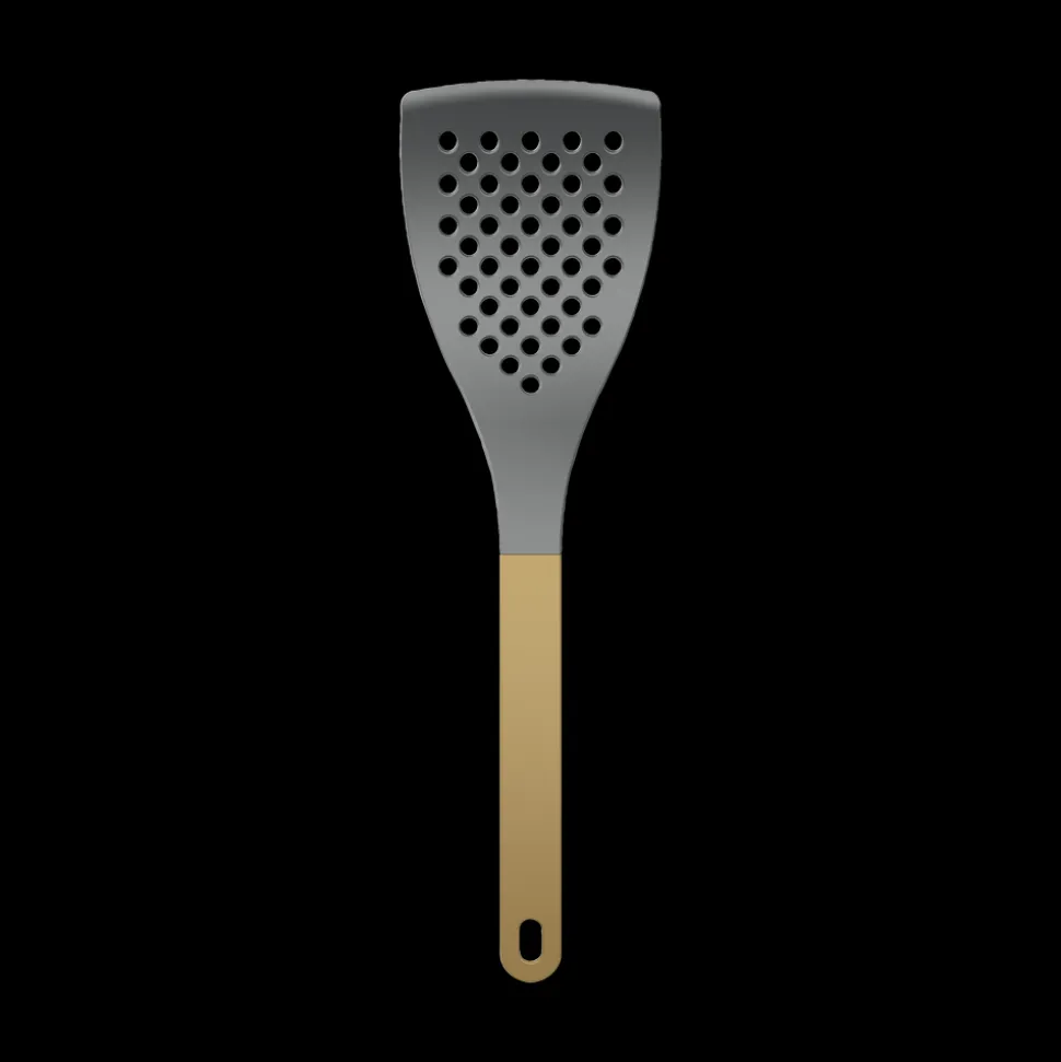 Stor palet med farvet skaft. 31 cm. Bladet er perforeret, og med en bredde på 8,5 cm er paletten velegnet til at håndtere større fødevarer på panden, såvel kød som grøntsager. Fremstillet i nylon, der er skånsomt mod gryder og pander med belægning og tåler varme op til 220 grader C. Slankt og ergonomisk design med praktisk ophængshul. Velegnet til opvaskemaskine.
