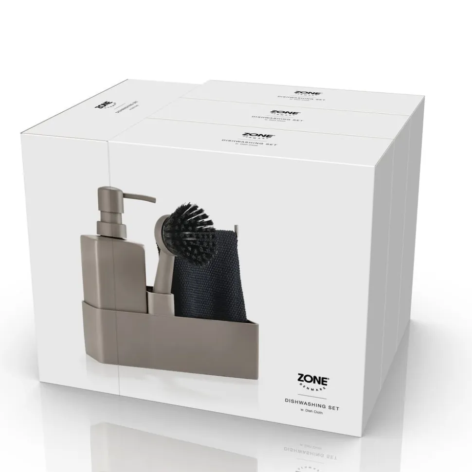 Zones populære alt-i-ét opvaskesæt med karklud. Sæbedispenseren er fremstillet i solid keramik, og opbevaringsdelen er i ridsefri og rengøringsvenlig silikone. Børsten kan stå selv, og børstehovedet kan udskiftes, så du altid har en frisk børste.