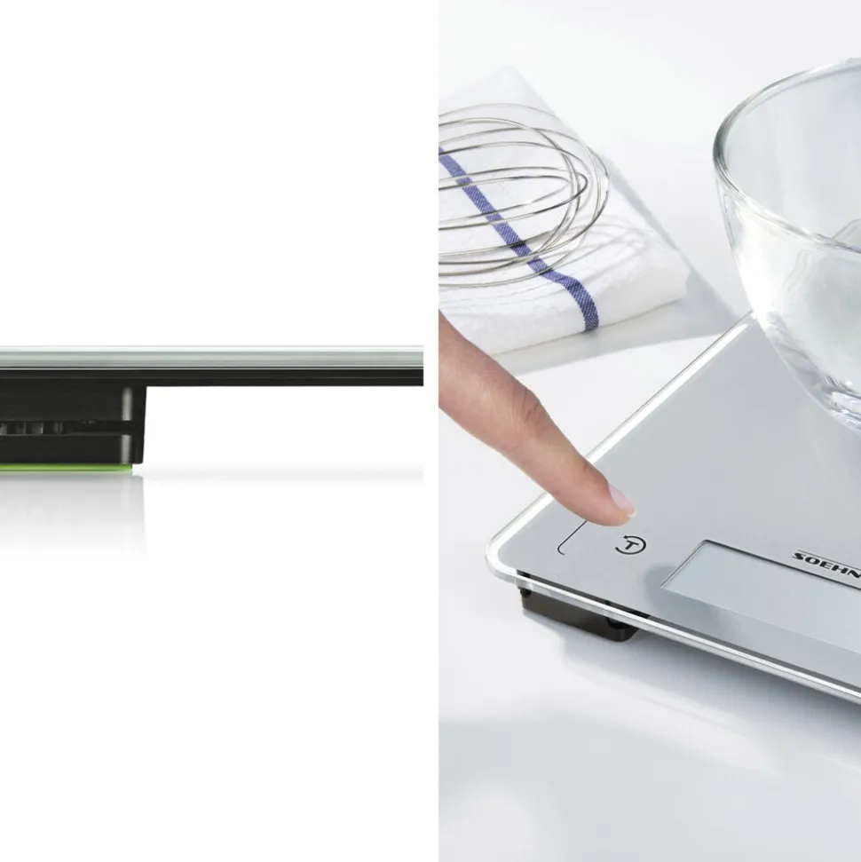 Alle ingredienser kan vejes separat med tarafunktionen i præcise 1 grams trin. Det ekstra store LCD-display er nemt at aflæse, og med sensor-touch-funktionen behøver du kun at trykke ganske let på kontrolpanelet. Vægten slukker automatisk. Det sparer energi, så de medfølgende batterier holder længere. Batterierne sidder i et børnesikkert batterirum.