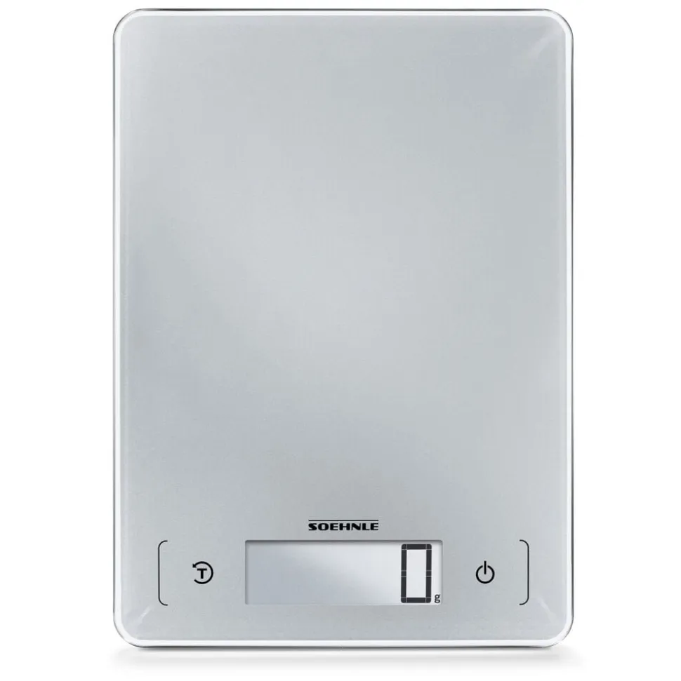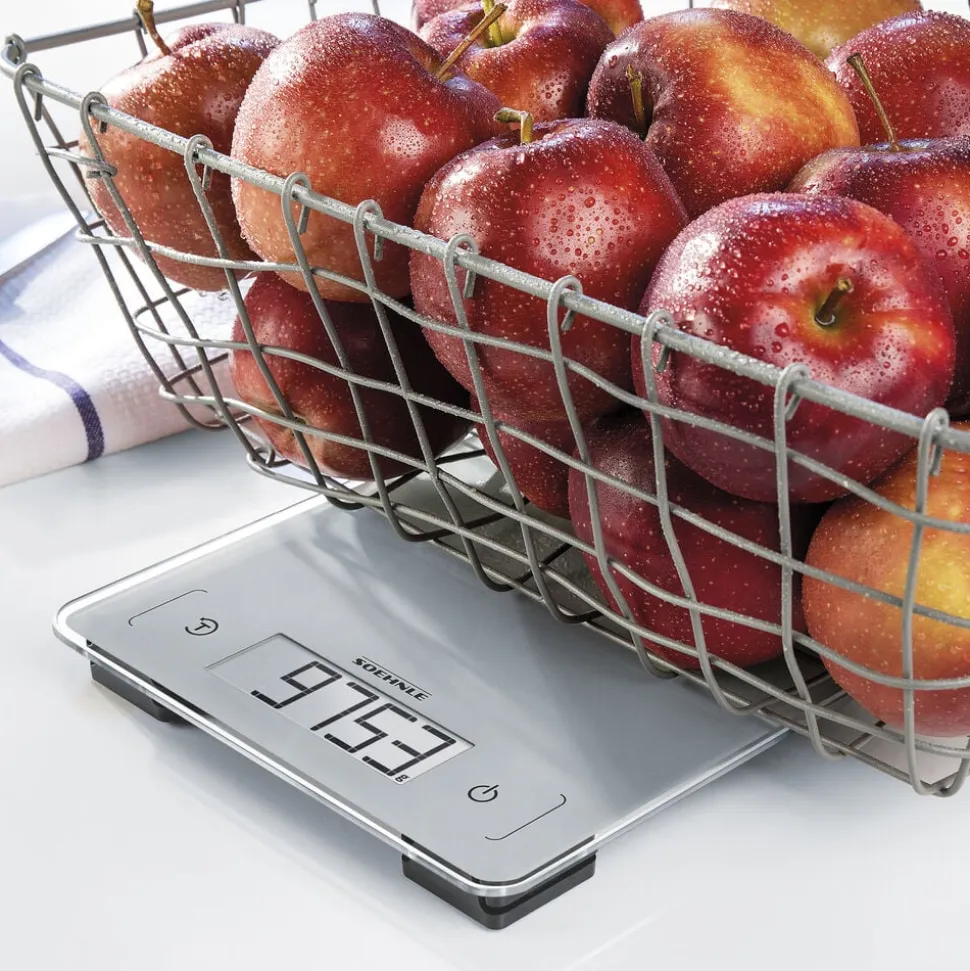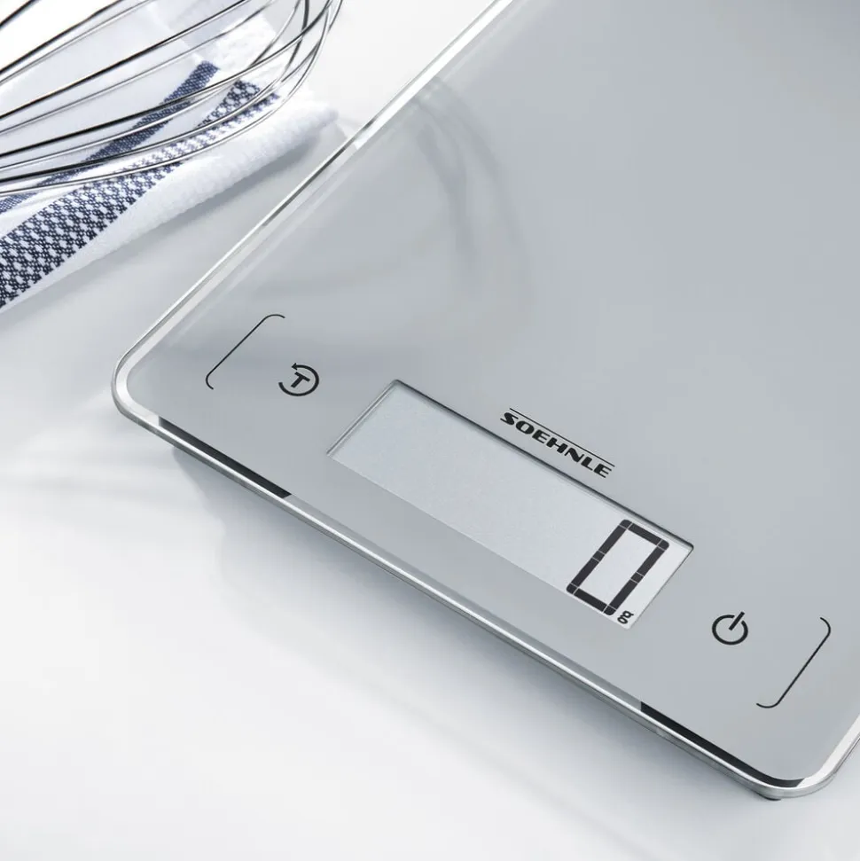 Stor køkkenvægt med LCD-display, sensor-touch og stor overflade. Vejer op til 10 kg med 1 g interval. Vandtæt. Kan rengøres i opvaskemaskine eller under rindende vand.