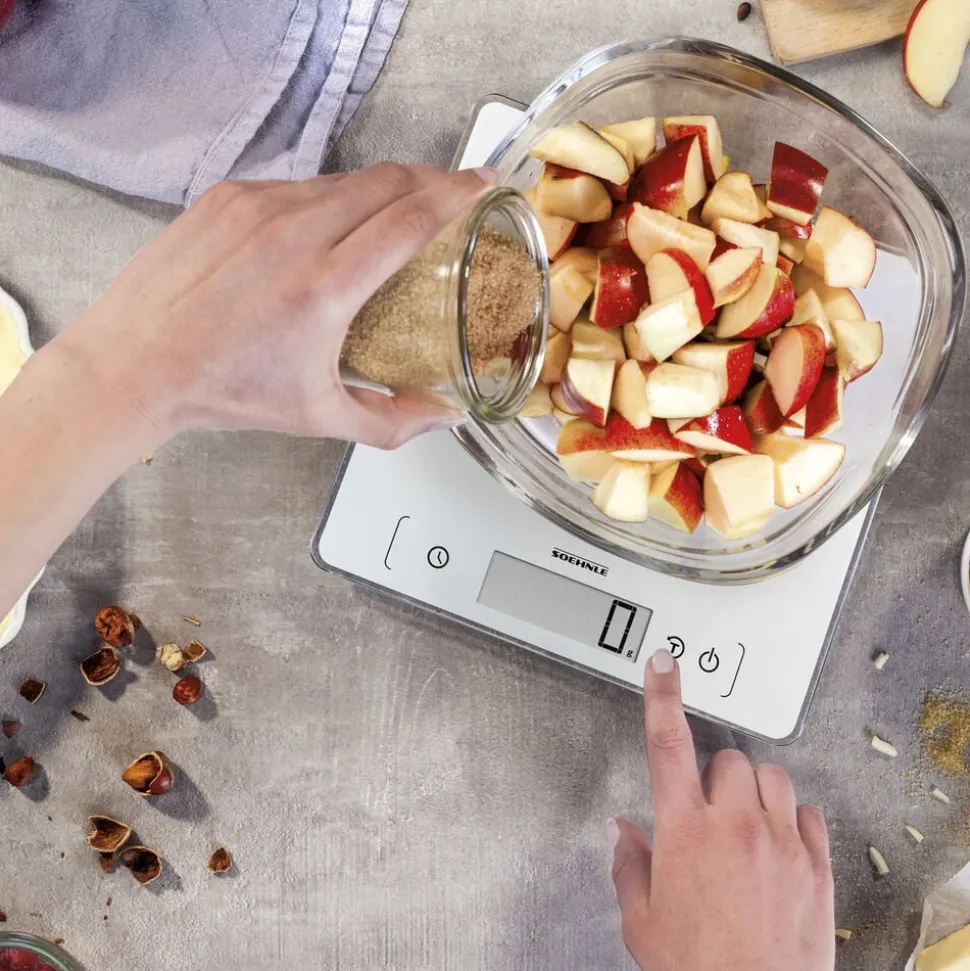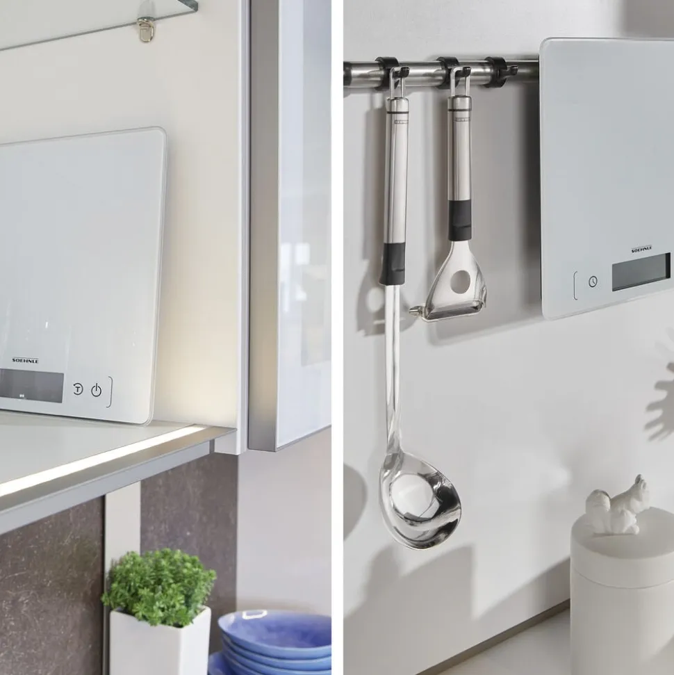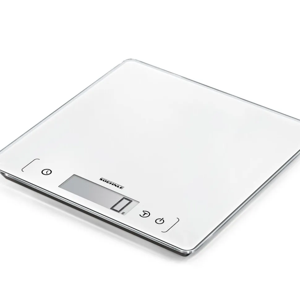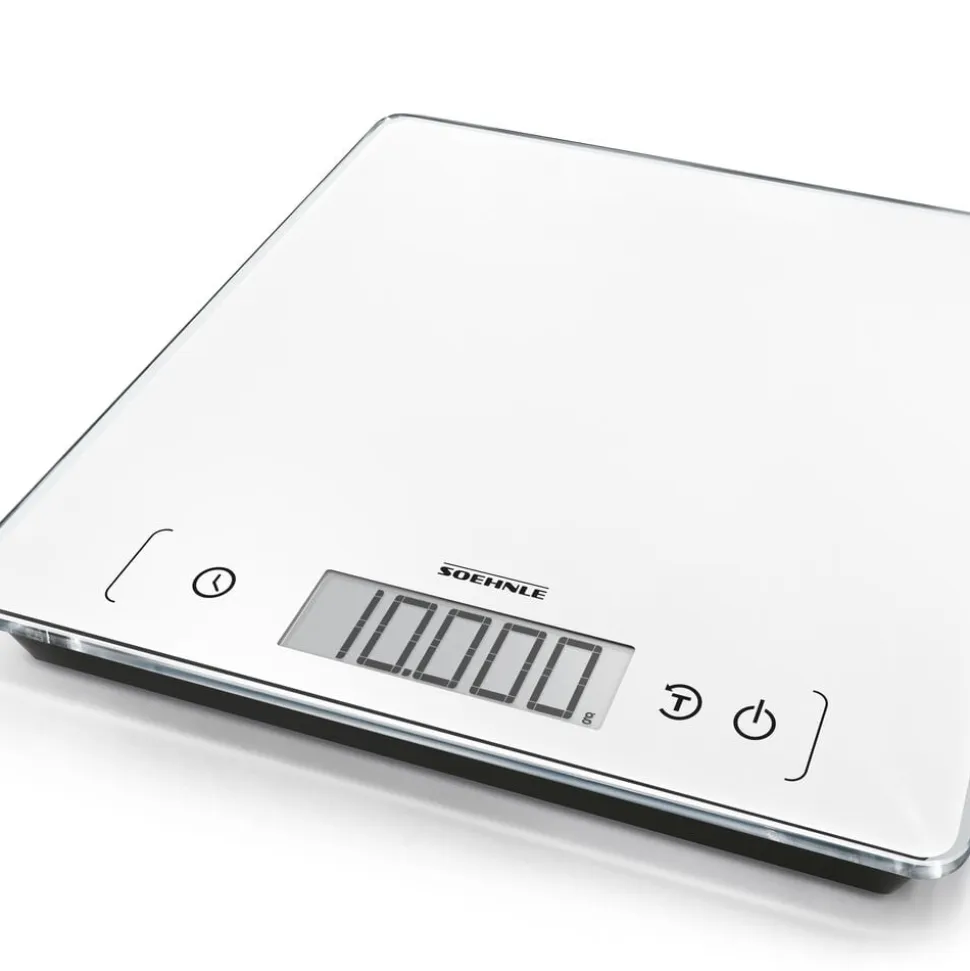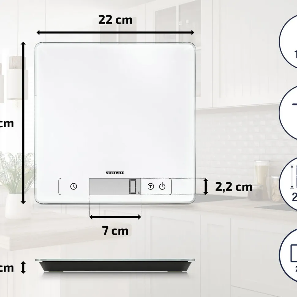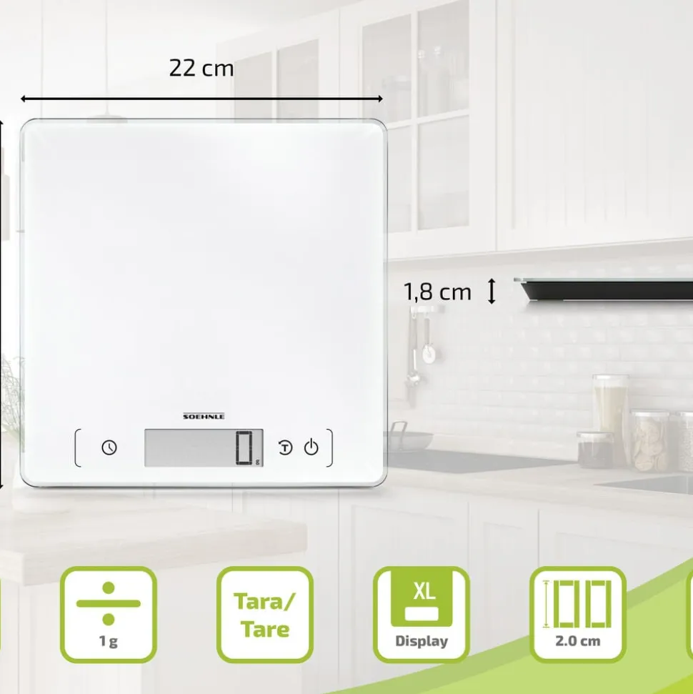 Køkkenvægt i kompakt og ekstra tyndt design, 22 x 22 x 1,8 cm. Vejer op til 10 kg med interval på 1 g, hvilket gør den ideel til fx krydderier. Letlæseligt display, tarafunktion og energisparende autosluk-funktion. Enhederne vises i g/kg eller oz/lb.