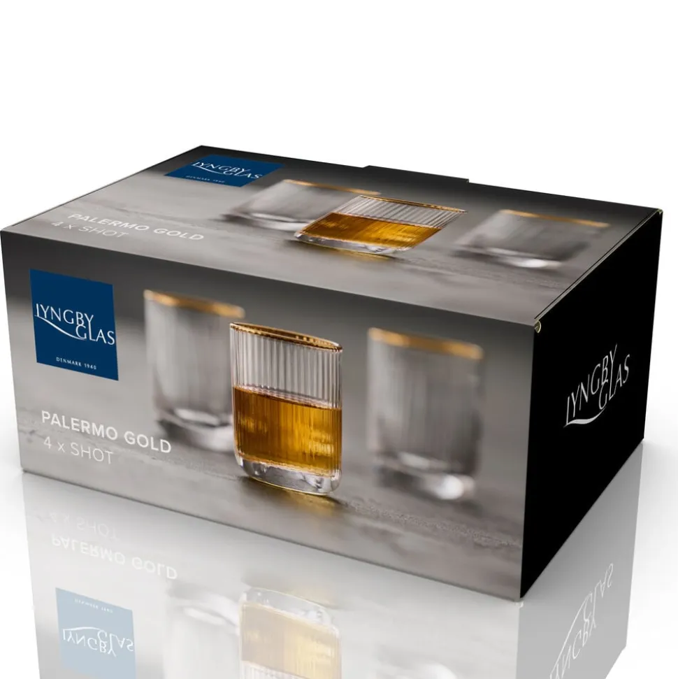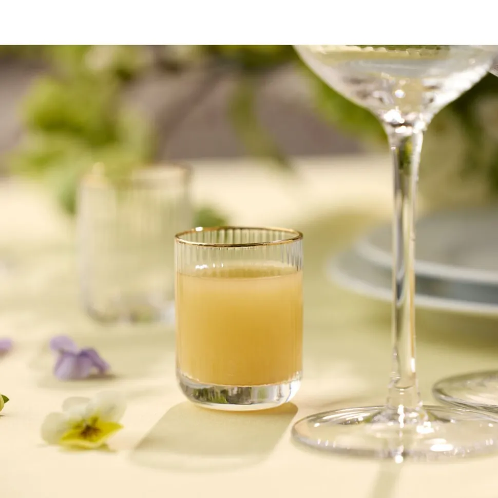 Smukt shotglas med bløde, rundede former. Det elegante, riflede design med en fin guldkant giver glasset et flot vintagelook, der samtidig afspejler tidens trends. Brug det til at servere dine yndlingsshots og lad de fine facetter reflektere lyset og glassets indhold på smukkeste vis. 6 cl. Sæt med 6 stk.