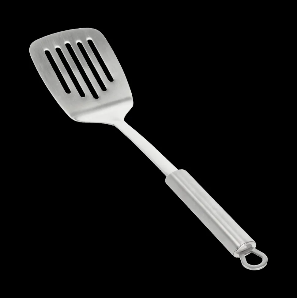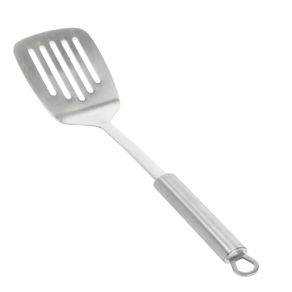 Den brede stålpalet har strategisk placerede huller i det 8,4 cm brede blad. Det sikrer nem og effektiv håndtering af selv store stykker grøntsager og kød, mens overskydende saucer og olier let drænes væk. Paletten er fremstillet helt igennem af rustfrit stål, hvilket giver den både et moderne look og lang holdbarhed. Velegnet til opvaskemaskine.