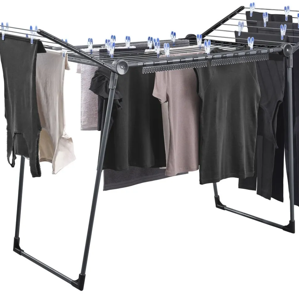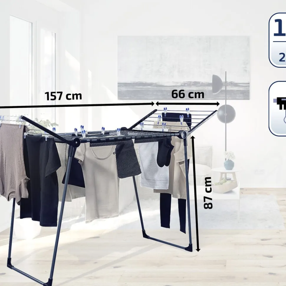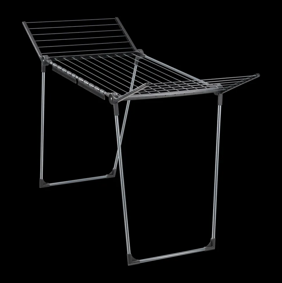 Pegasus 180 Solid Black er et robust tørrestativ med masser af plads til dit vasketøj. De stabile, parallelle ben gør, at det står sikkert både inde og ude, og med 18 meter tørreplads kan du hænge næsten to maskinvaske op ad gangen. De foldbare sidevinger har en vingehøjde på 105 cm høje, så længere tekstiler som bukser og håndklæder kan hænge uden at røre gulvet. Som en ekstra smart detalje følger der to smarte holdere med, så du nemt kan hænge små dele som strømper og undertøj op – helt uden klemmer. Når tørrestativet ikke er i brug, kan det let klappes sammen og opbevares pladsbesparende. De sorte og antracitgrå tørrestænger har en slidstærk pulverlakering, der gør dem rustfri og ekstra holdbare.