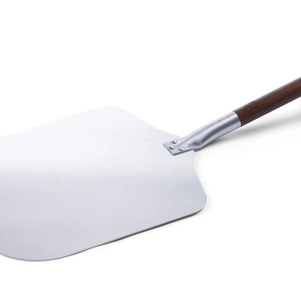 Stor pizzaspade i aluminium med trægreb. Den store flade på 35,5 x 30,5 cm og det kraftige håndtag med en længde på 28 cm gør pizzaspaden velegnet til at håndtere selv større pizzaer og brød. Håndopvask anbefales, også inden brug første gang.
