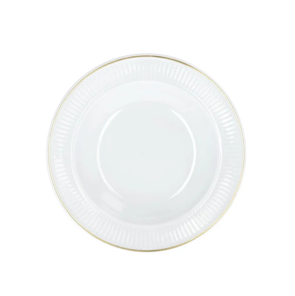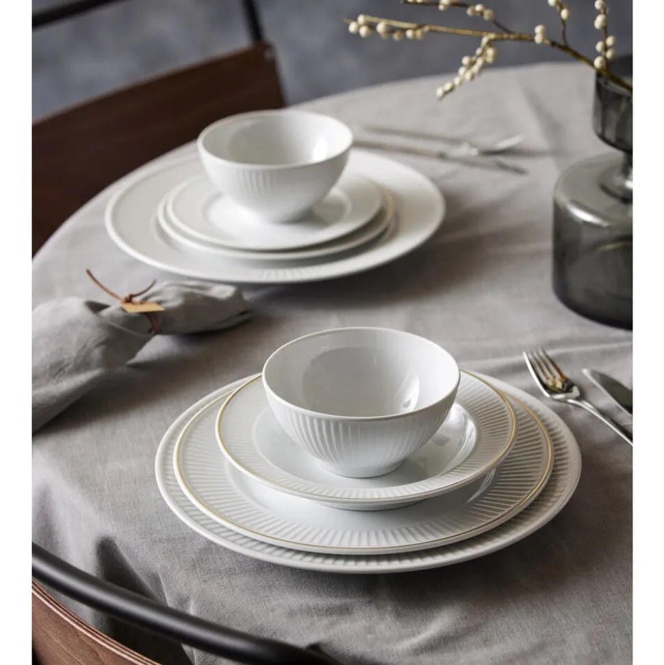 Håndmalet guld giver en elegant kant til Pillivuyts klassiske Plissé-kollektion. Bland guldkantet service med andet hvidt porcelæn eller dekorerede produkter, og festmåltidet er sikret i mange år frem.