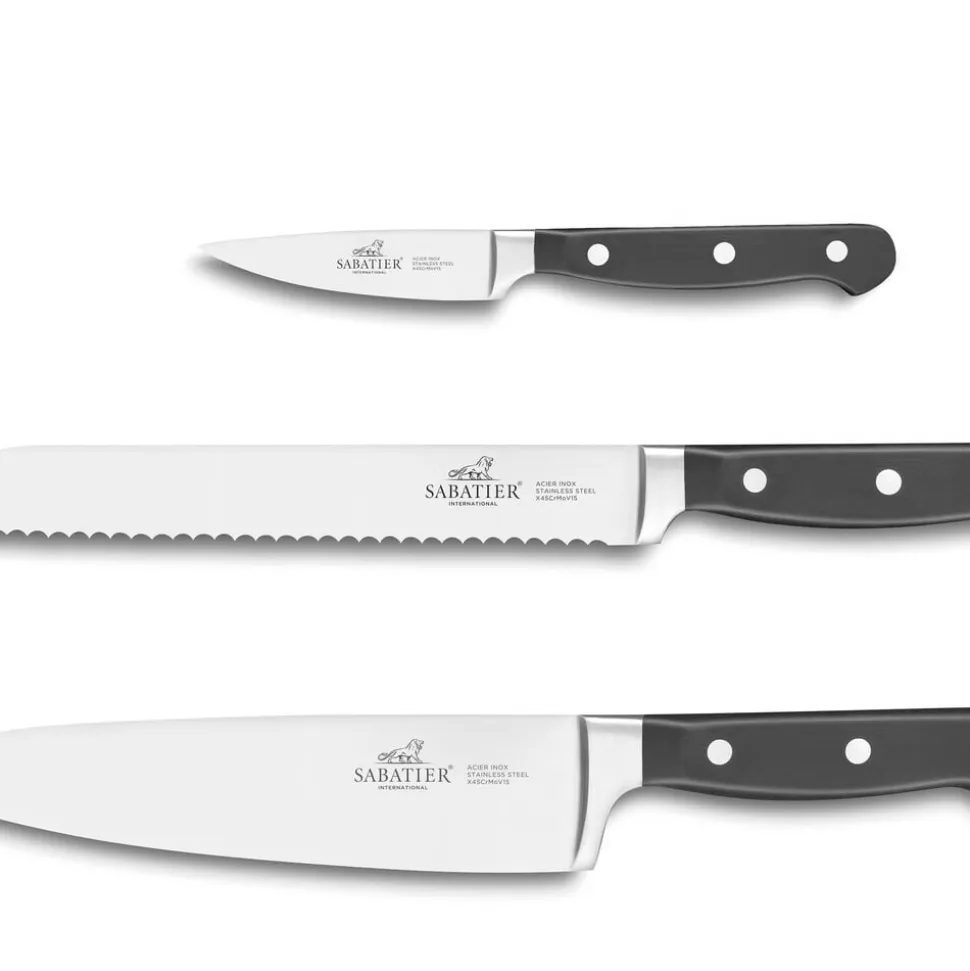 Urtekniv 9 cm, brødkniv 20 cm og kokkekniv 20 cm.