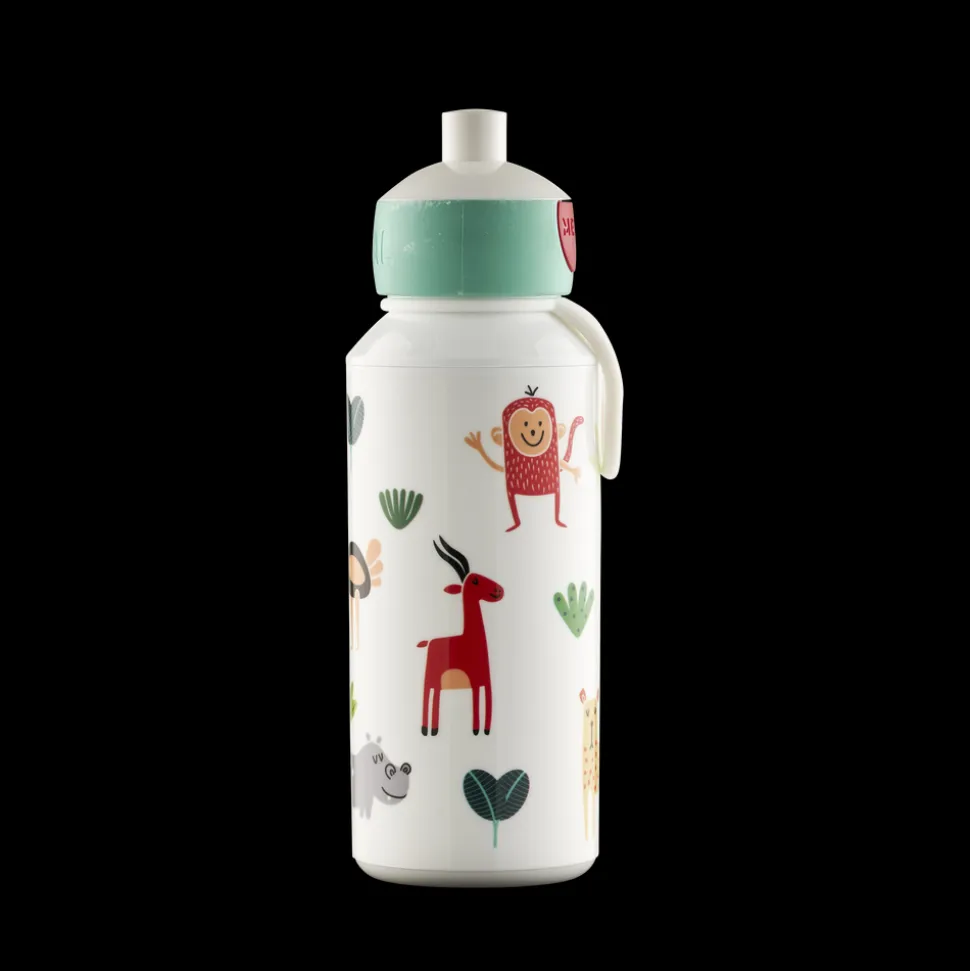 Mepal pop-upflaske med motiv med dyr fra savannen. Den kendte, robuste drikkeflaske har fået silikonestrop, større flaske og et nyt forbedret pop-up system, der er endnu nemmere at skille ad og rengøre. 400 ml.