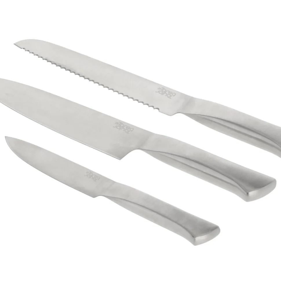Knivsæt bestående af urtekniv 9 cm, brødkniv 20 cm og kokkekniv 20 cm.