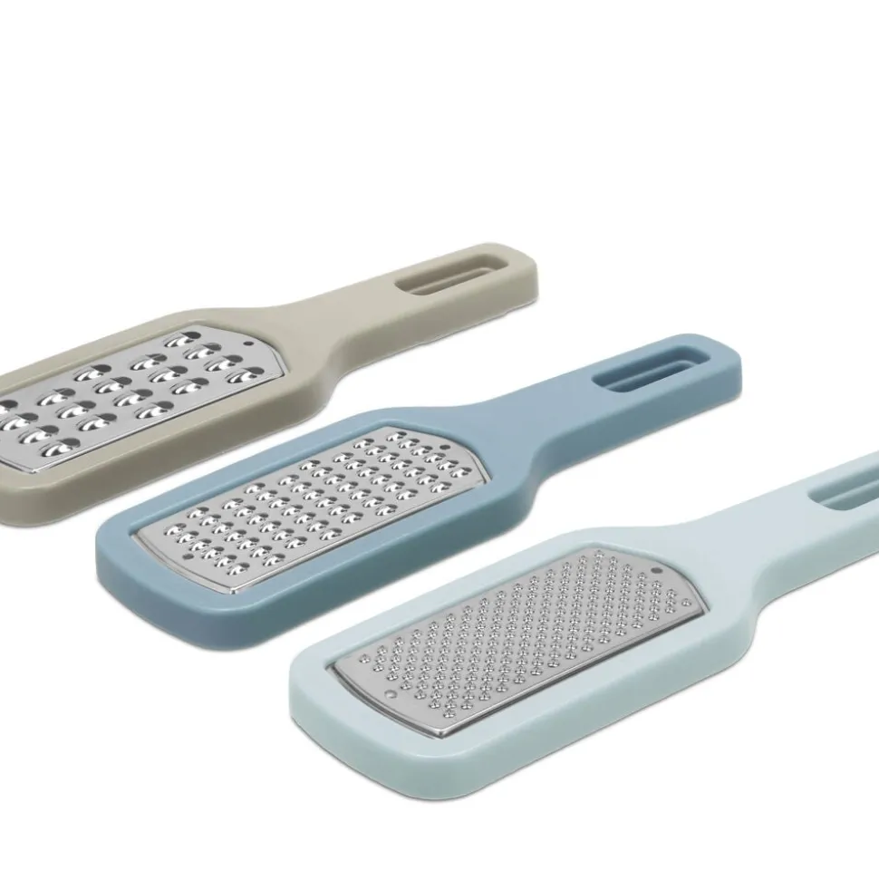 Dette praktiske sæt med tre rivejern gør madlavningen nemmere og mere effektiv. Sættet indeholder rivejern med tre forskellige skærstørrelser: grov, mellem og fin. Det grove rivejern er perfekt til ost eller grøntsager, det mellemstore til chokolade eller rodfrugter, og det fine rivejern har spidser, der gør det ideelt til at rive citrusskal eller muskatnød. Rivejernene kan klikkes sammen for kompakt opbevaring, hvilket sparer plads og holder dem samlet.