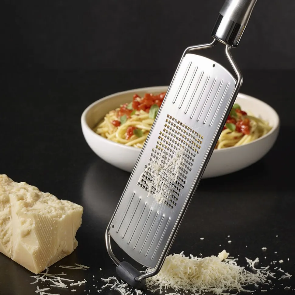 RÖSLE fint rivejern med håndtag lavet udelukkende af rustfrit stål. Det ergonomisk formede håndtag føles sikkert i hånden og har en praktisk krog til ophængning som perfekt afslutning. Ideelt til hård ost, fx parmesan til fuldendt pasta, til krydderier, chokolade eller ingefær, når du skal bage. Rivejernets specielt formede tænder sørger for hurtig rivning med en minimal indsats.