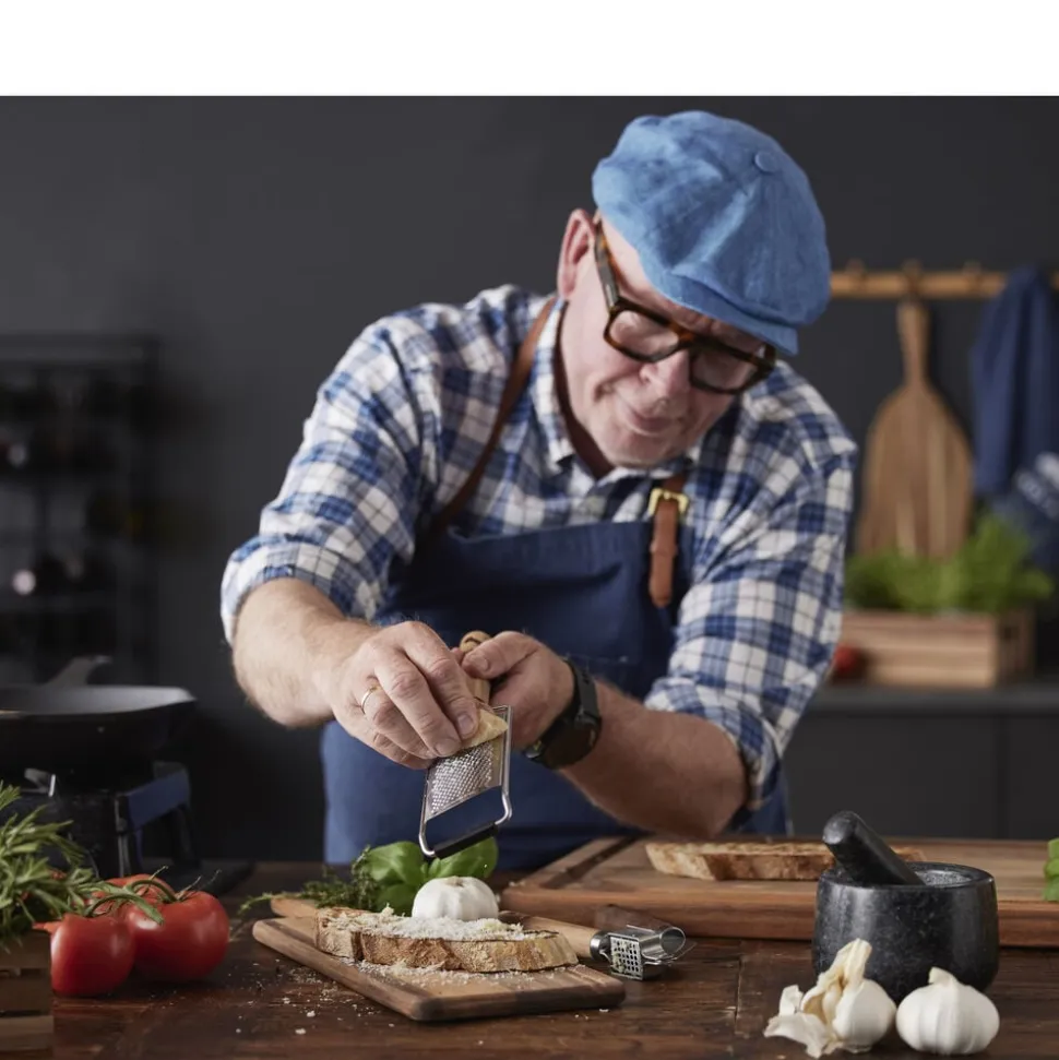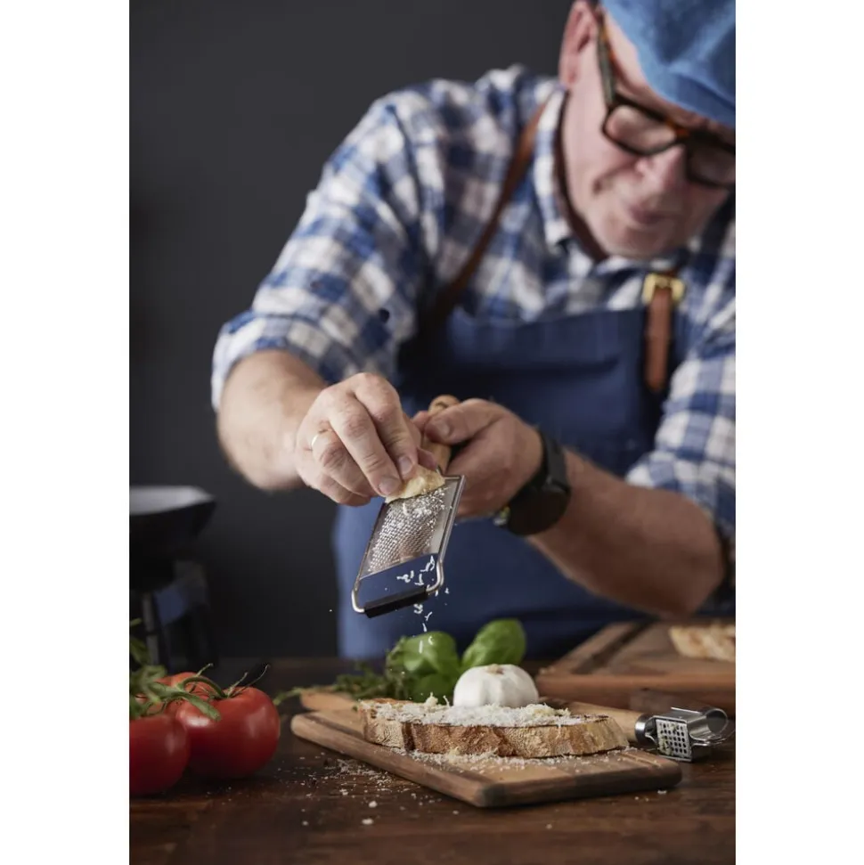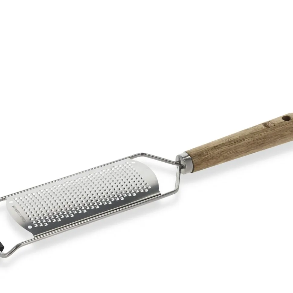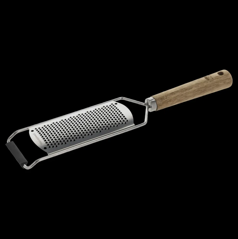 Fint rivejern med stor riveflade i rustfrit stål og skaft af akacietræ. Velegnet til parmesanost, muskatnød, hvidløg, citronskal og lignende. Rivejernet har en trekantet silikoneforstærkning i bunden, så det står bedre fast, når du støtter det mod underlaget ved brug, samt beskyttende skærebladsværn for sikker opbevaring.