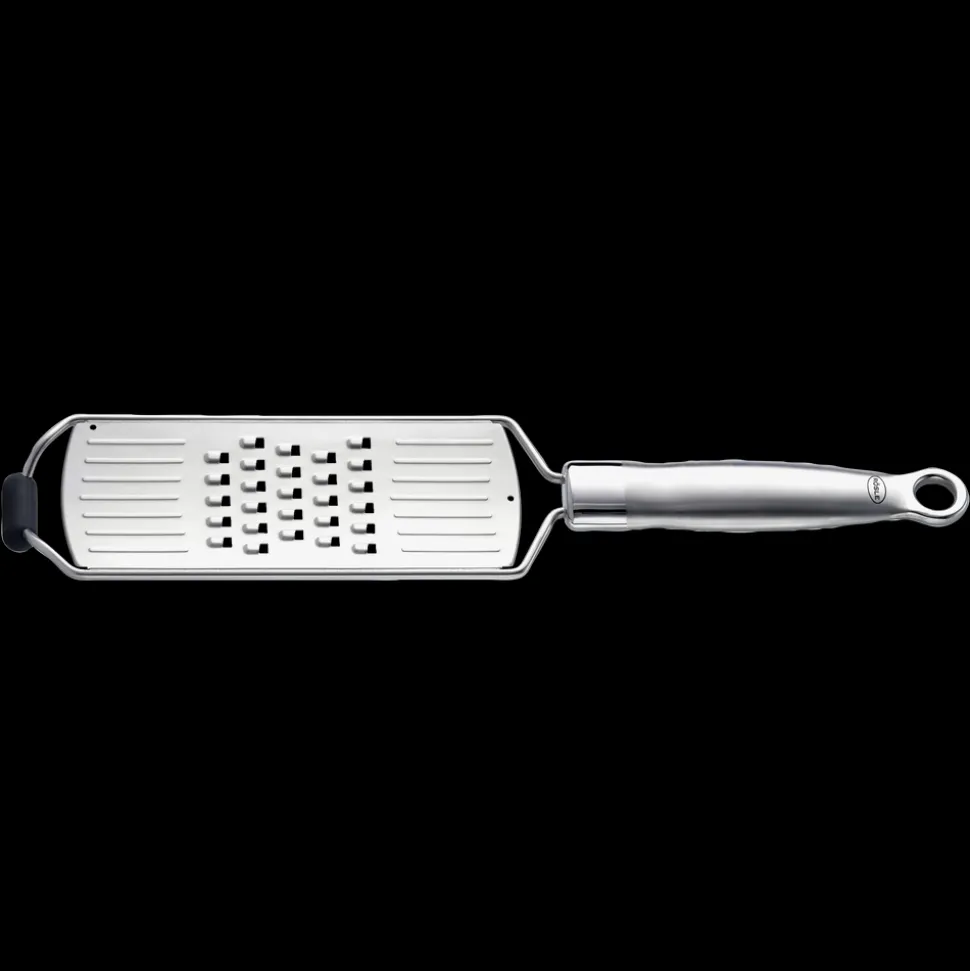 RÖSLE medium rivejern med håndtag lavet udelukkende af rustfrit stål. Det ergonomisk formede håndtag føles sikkert i hånden og har en praktisk krog til ophængning som perfekt afslutning. Ideelt til rivning af hårdere grøntsagstyper som agurker, gulerødder, rødbeder og kålrabi. Også ideelt til chokolade og ost. Rivejernets specielt formede tænder sørger for hurtig rivning med minimal indsats.
