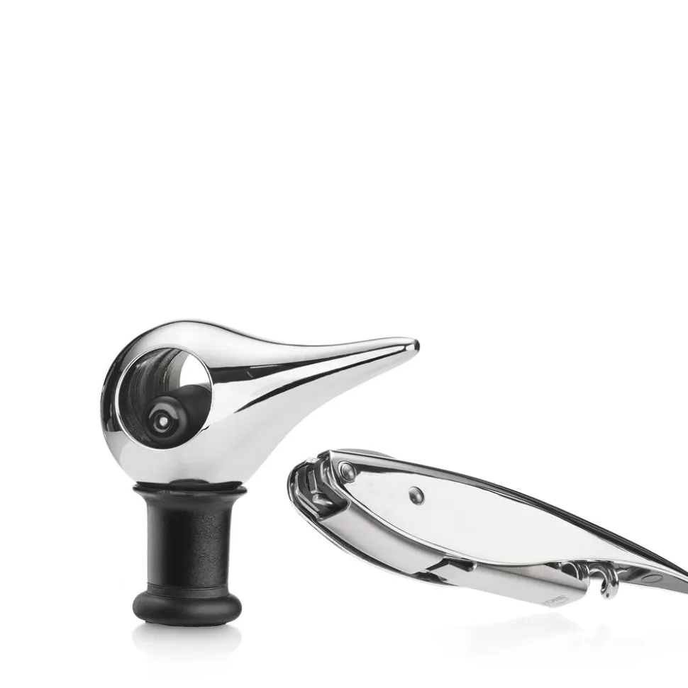 Zones elegante vinsæt består af Bird vinprop og Feather proptrækker. Feather er en lækker fortolkning af tjenerværktøjet, en klassiker i ny fjerdragt. Feather har indbygget folieskærer og oplukker, og den bøjelige arm gør det let at åbne flasken i to trin uden at bruge mange kræfter. Kan let foldes sammen og tages med på fx picnic. Det elegante figurative design i vinproppen Bird har en genial funktion. Sæt proppen i din åbne vin, vip fuglens næb til modsatte side og få en helt tætlukket flaske. Den kan ovenikøbet ligge ned i køleskabet, til du igen får lyst til et glas. Design: Mencke og Vagnby.